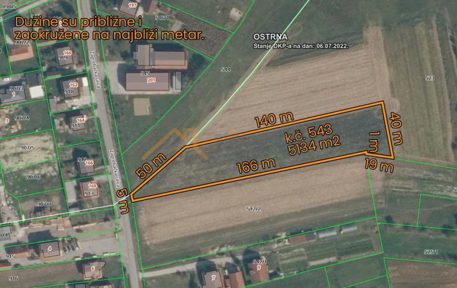 Prodaje se zemljište u naselju Mala Ostrna, Dugo Selo, prednji dio zemljišta nalazi se u građevinskoj zoni – stambene namjene (cca 1000 m2), dok je ostatak parcele van građevinske zone Ukupna površina zemljišta iznosi 5134 m2.