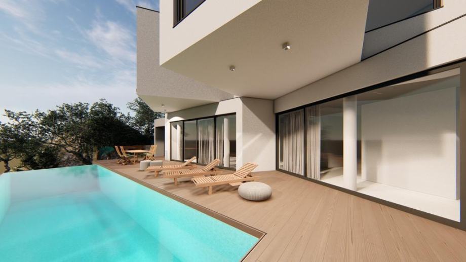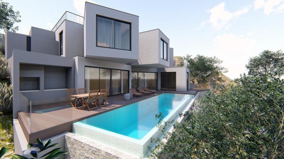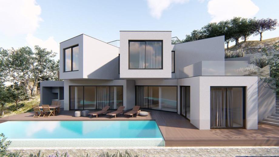 Građevinsko zemljište s pogledom na more s pravomoćnom dozvolom za igradnju vile s bazenom. Udaljenost od mora 300m zračne linije. Asfaltni pristup, struja i voda uz parcelu.
