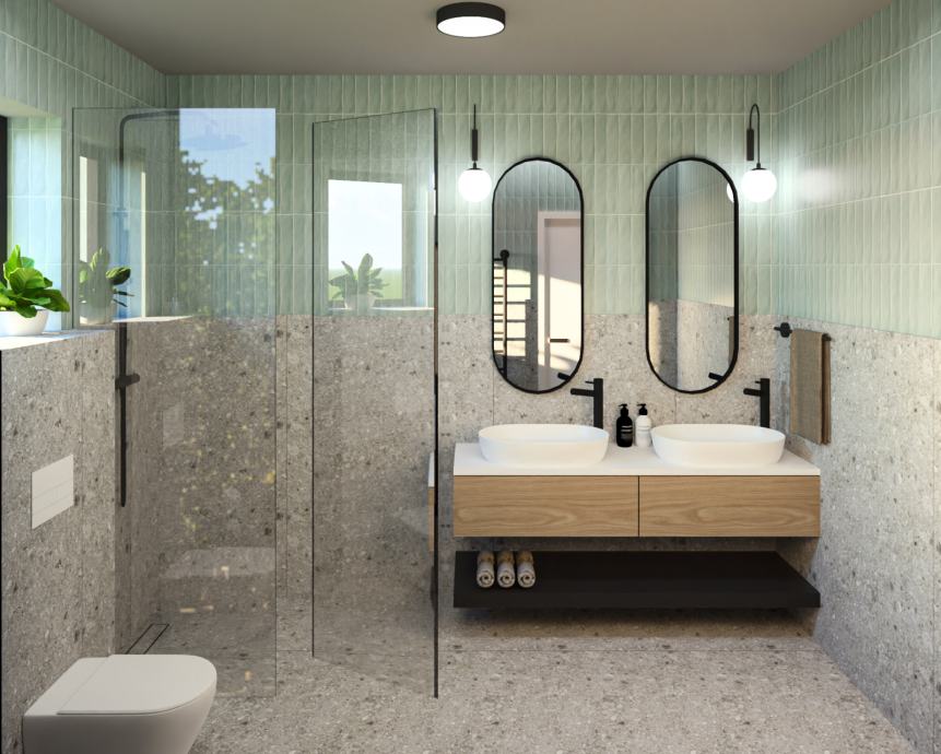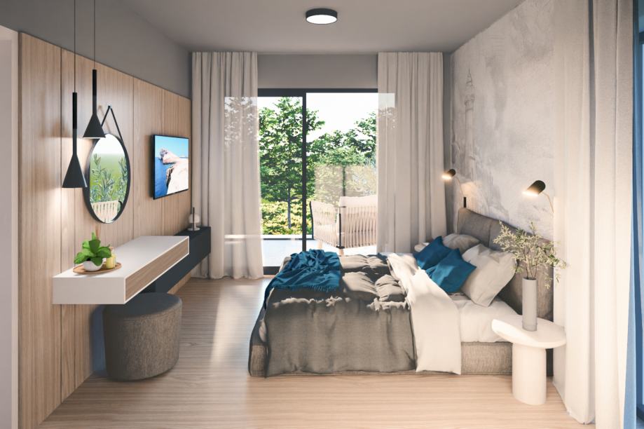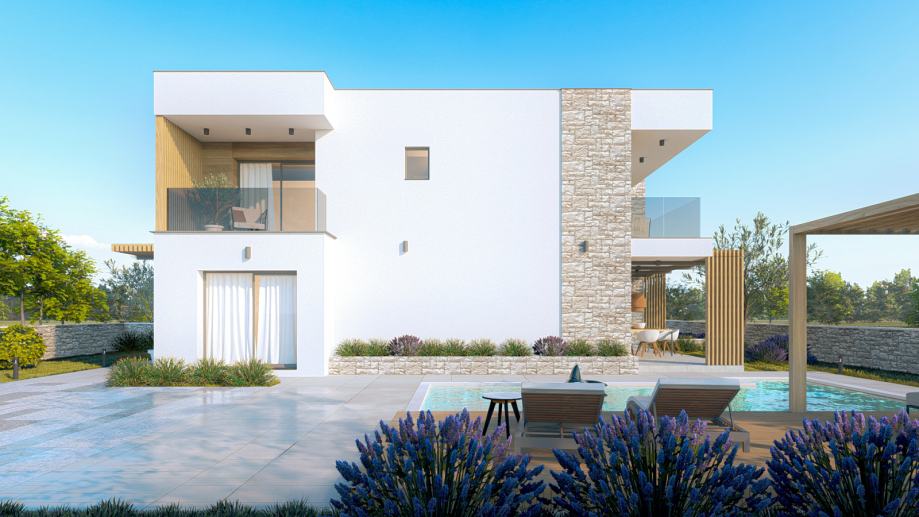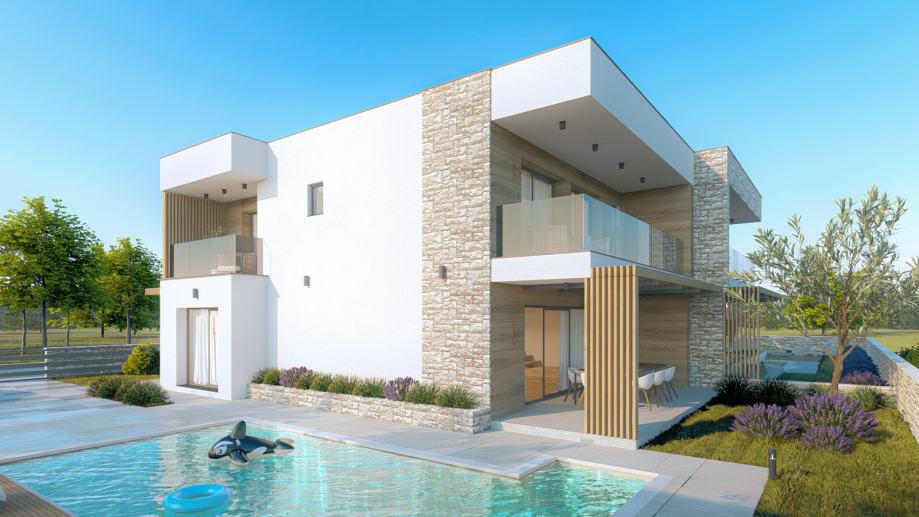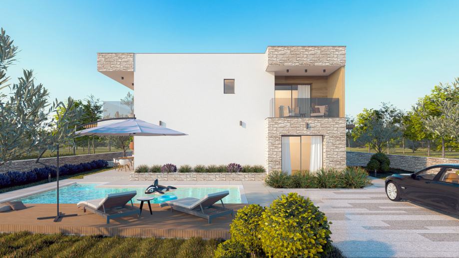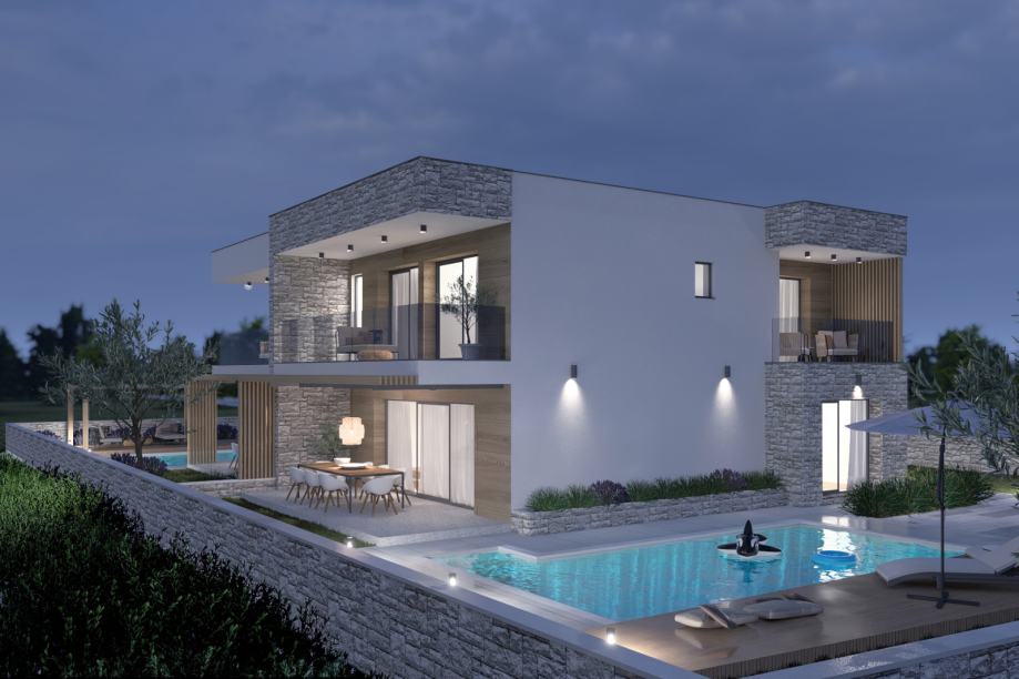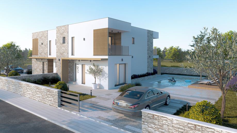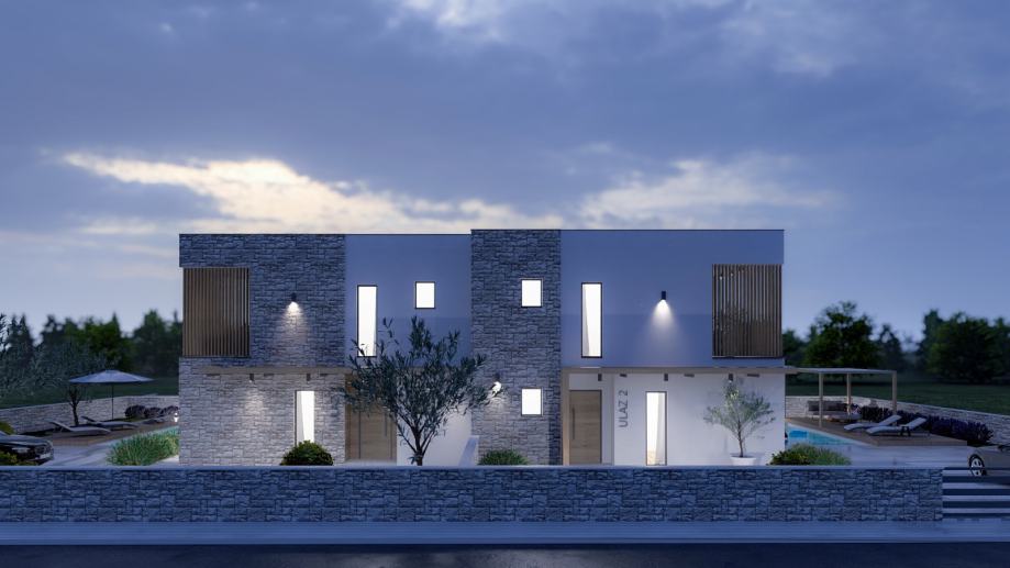 Na katu se nalaze tri spavaće sobe sa vlastitom kupaonicom .Vanjski dio ima terasu ,bazen 8x4m,te dva parkirna mjesta.