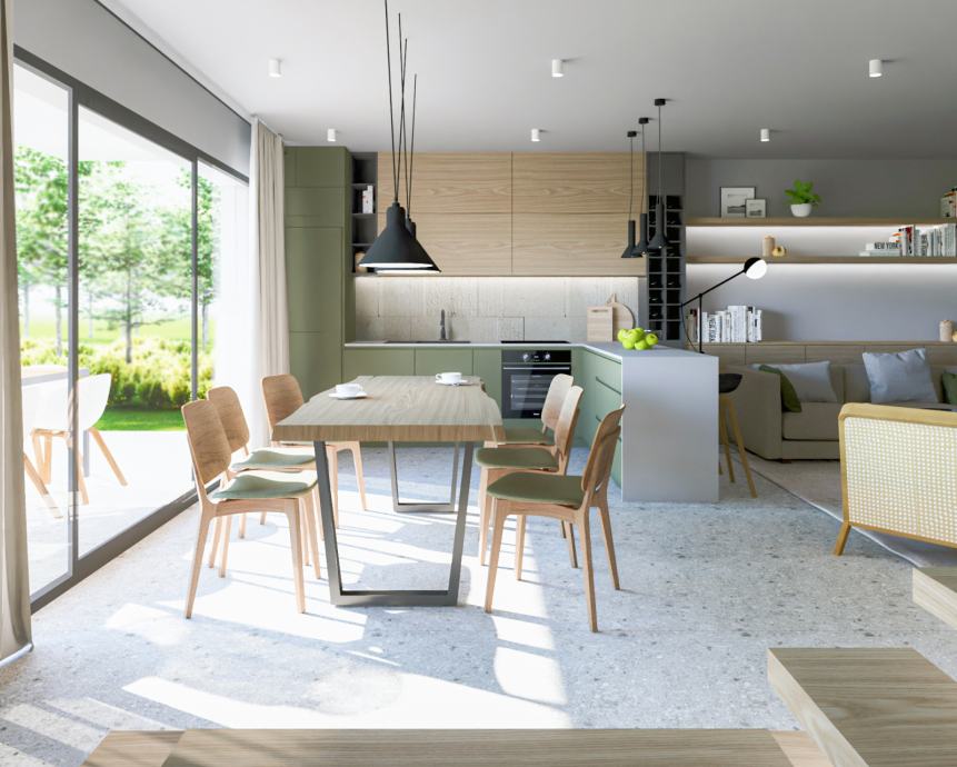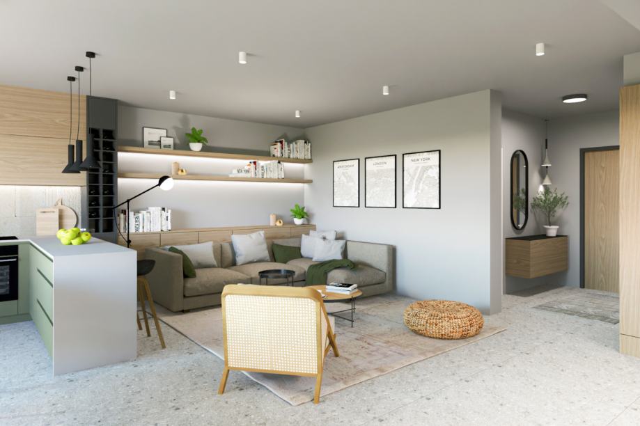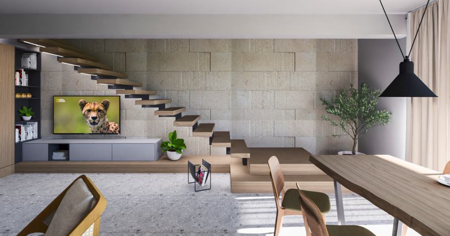 Kuća je koncipirana kao dvoetažni stan. U prizemlju se nalazi dnevni boravak sa kuhinjom ,spavaća soba, kupaonica i spremište.