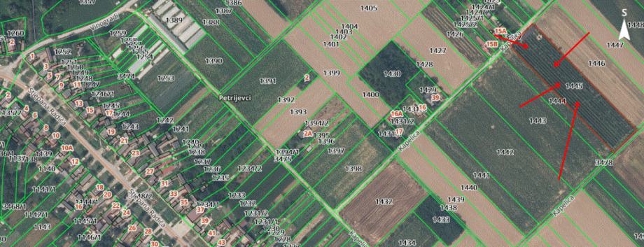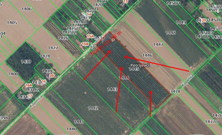 Građevinsko zemljište nalazi se u mirnijoj ulici Kapelica u Petrijevcima. Zemljište se prostire na površini od 7233m2, fronta je približno 38m. Na parceli se nalazi nadstrešnica od cca 60m2 koja trenutno služi u svrhu održavanja različitih prigoda, salaš kapaciteta do 150 osoba. Na parceli se nalazi bunar. Na udaljenosti od 150m nalazi se rijeka Karašica.