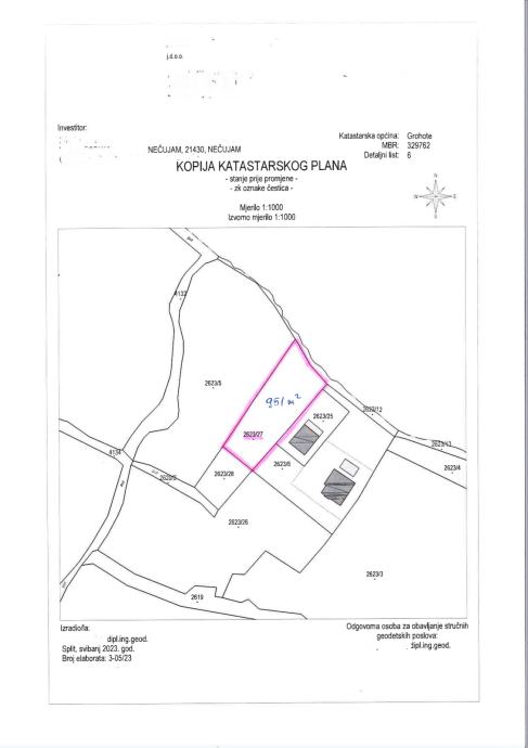 Prostrano zemljište 951m2 (app 22 x 43m) na kaskadnom terenu prvi red do mora u građevinskom području sa pristupnim putem i priključcima za vodu i struju. U maloj tihoj uvali u Nečujmu na Šolti okruženo zelenilom u slabo naseljenoj i odlično zaklonjenoj od vjetra i nevremena. Odlična pozicija ,samo 2km od Grohota sa tržnicama i trgovinama. Kaskadni teren okružen zelenilom omogućava gradnju s otvorenim pogledom na Nečujamsku uvalu.