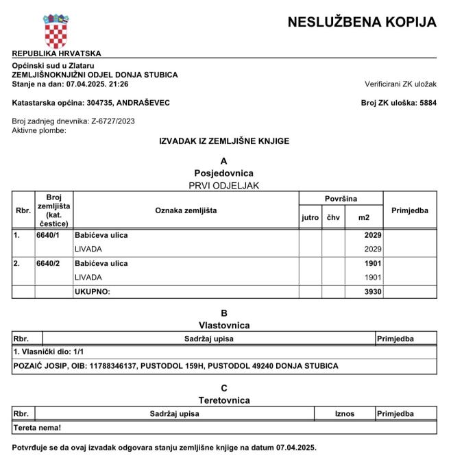 Vlasništvo uredno, bez tereta,