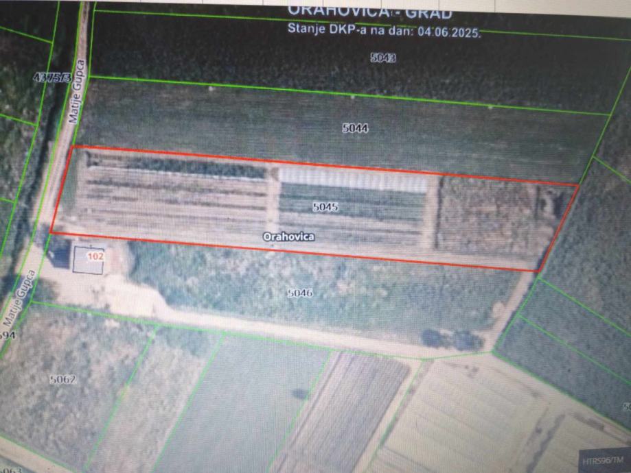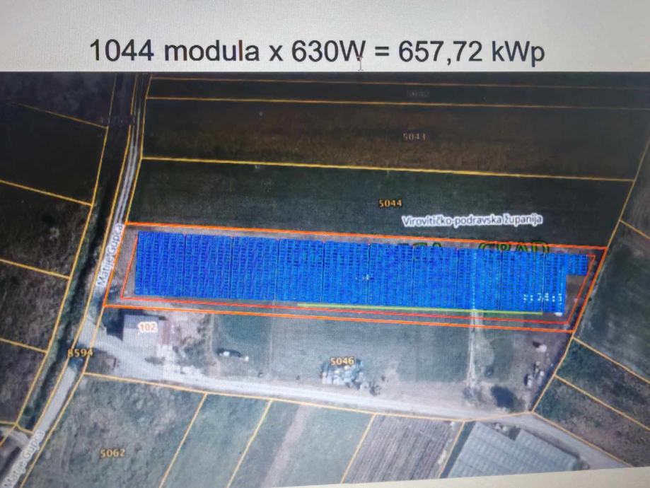 Prodajem građevinsko zemljište površine 5063 m2 u Orahovici. Na njemu je moguće postaviti solarnu elektranu od 657 kwp. Zemljište je iznajmljeno do 1. 4. 2027.