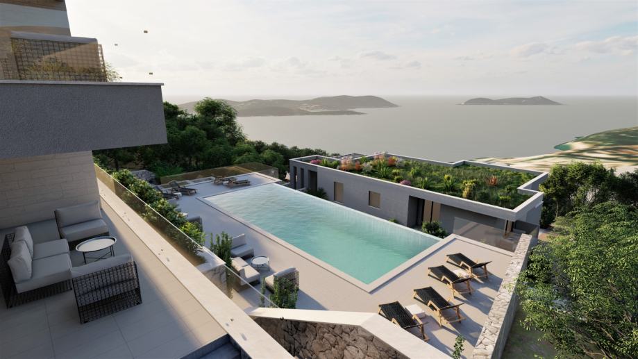 Dizajn je savršeno integriran u konfiguraciju terena i orijentiran prema pogledu, te uključuje bazen.