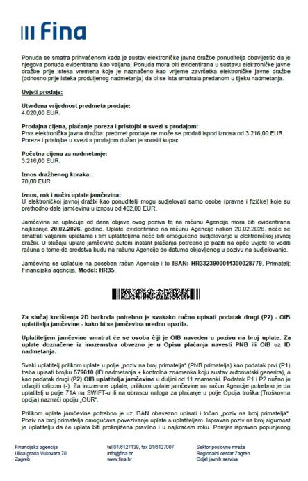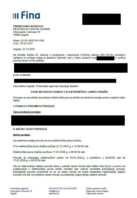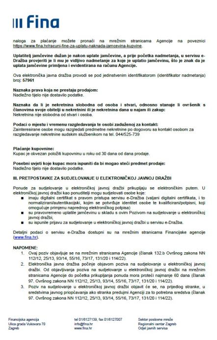 Ovaj oglas predstavlja poziv za sudjelovanje na drugoj elektroničkoj javnoj dražbi. Svi detalji o sudjelovanju na dražbi nalaze se u fotografijama.