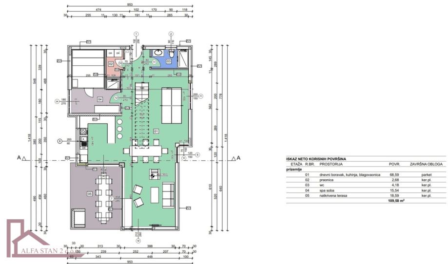 - Dnevni boravak, kuhinja i blagovaonica: 68,59 m2