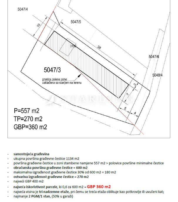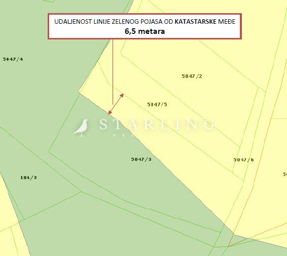 Prodaje se građevinsko zemljište pravilnog oblika površine 1134 m2. Veći dio zemljišta (cca 557 m2) se nalazi u zoni stambene namjene, dok je preostali dio u zoni zelene površine.