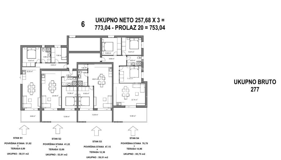 Na zemljištu se može graditi objekt od tri etaže s ukupno 12 stanova, tlocrte idejnog projekta možete pronaći u galeriji.