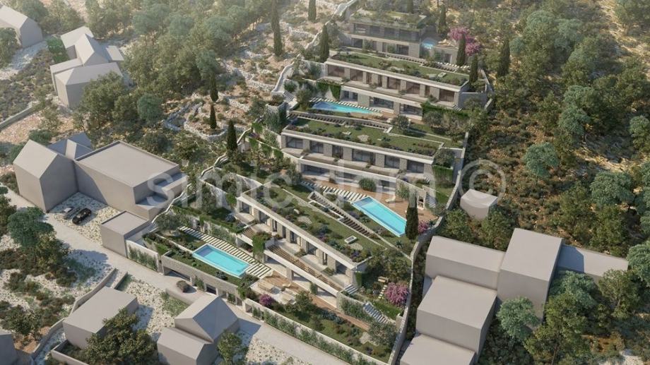 Na prodaju je građevinsko zemljište površine 5330 m2, smješteno nedaleko od Dubrovnika, s predivnim pogledom na more. Projekt podrazumijeva kompleks od četiri luksuzne vile, svaka sa 4-6 soba, uz dodatni luksuzni i moderni sadržaj kao što su bazen, jacuzzi, saune, prostor za roštilj i mnogidrugi. Vile površina od 148 do 448 m2 sastoje se od dvije etaže - prizemlja i prvog kata. U prizemlju se nalaze bazen i opremljeno sunčalište, ulazni dio, kuhinja, blagovaonica, dnevni boravak, wc, zatvoreni zeleni vrt, predvorje, wellness zona s jacuzzijem i saunom. Na etaži prvog kata su spavaće sobe sa, ovisno o vili, terasom ili loggiom. Podzemna površina osigurana je za odgovarajući broj parkirnih mjesta za svaku vilu i prateće objekte. Zemljište se nalazi na udaljenosti od 1 km od mora, a svojom atraktivnom lokacijom čini idealnu oazu mira i privatnosti.
