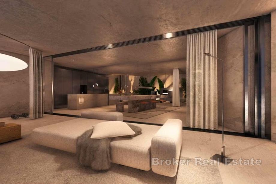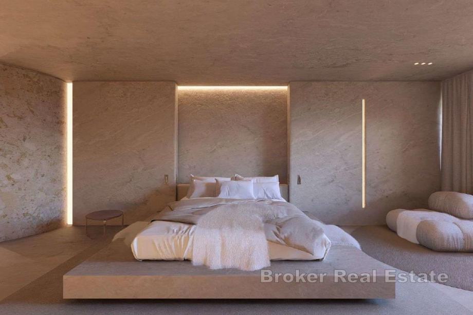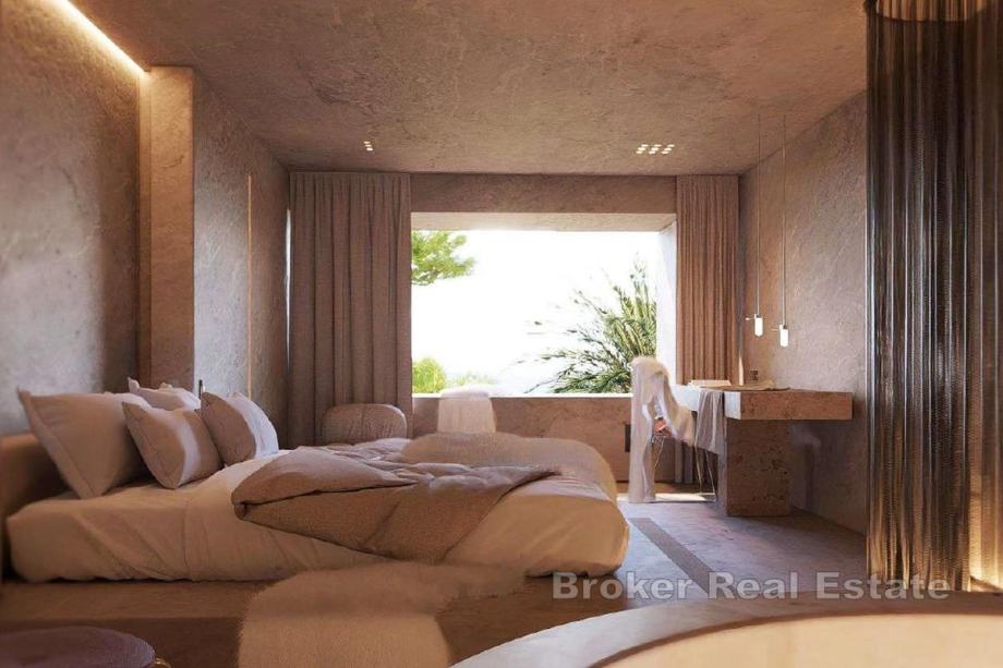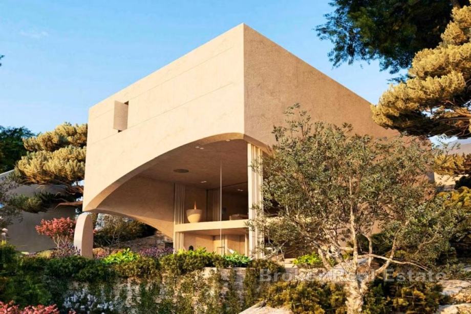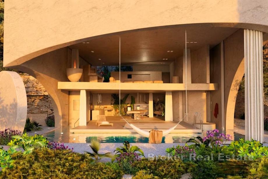 Zemljište se prodaje s projektom za izgradnju luksuzne vile s bazenom, koja spaja suvremeni luksuz s prirodnim materijalima i autentičnim elementima pomoću kojih se sjajno uklapa u okoliš.