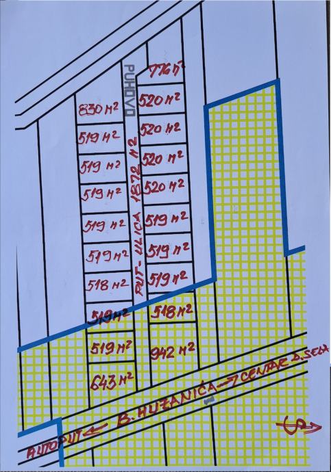 - parcelirano na 21 česticu k.o. Dugo Selo II z.k. uložak br. 928od 2826/1 zaključno sa česticom 2826/21 od kojih je 16 čestica površine 518 – 520 m², a preostale četri čestice površine942, 830, 776 i 643 m² te 1872 m² površine ulice,