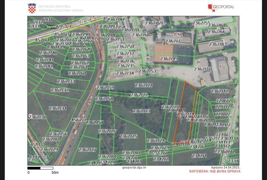Prodaje se zemljište površine 3057 m2 od čega je cca 1/3 dijela u građevinskoj zoni (planske oznake K- gospodarska - poslovna namjena), a 2/3 dijela poljoprivredno.Širina parcele cca 28m.