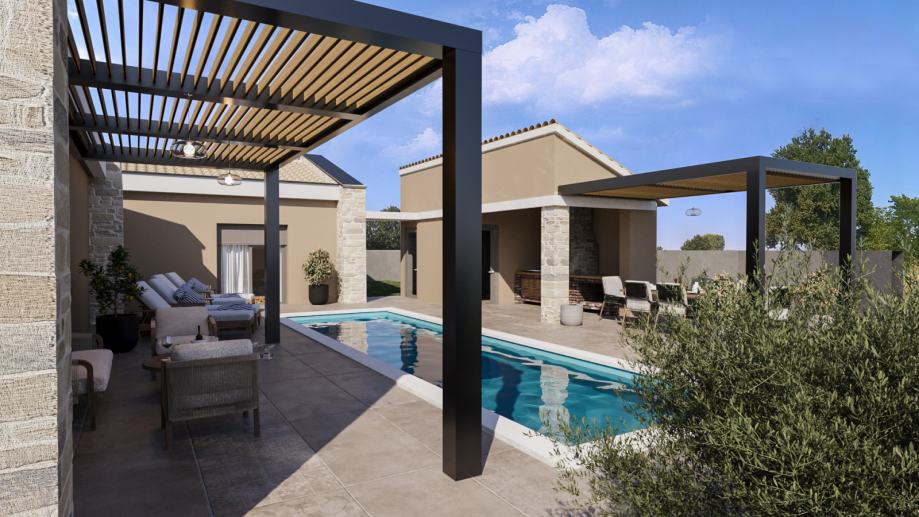 - napravljena vizualizacija dizajnerske vile sa bazenom i ljetnom kuhinjom