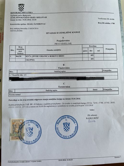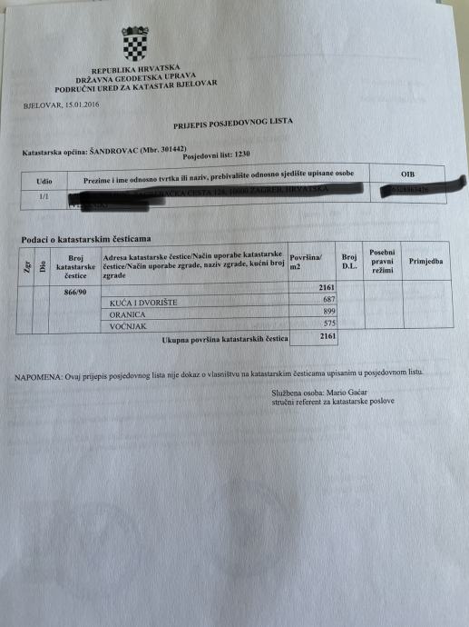 Građevinsko zemljište u Šandrovcu na lijepoj lokaciji, sa starom urušenom kućom koja je ucrtana u knjige. Na zemljištu zidani bunar s pitkom vodom i funkcionalna septička jama. Sve komunalije uz asfaltni put uz zemljište.