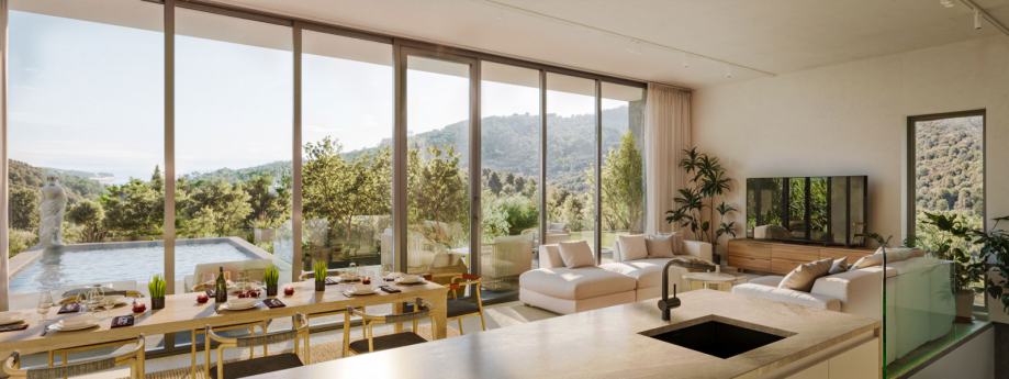Surroundings: A quiet micro-location surrounded by three modern villas with swimming pools.