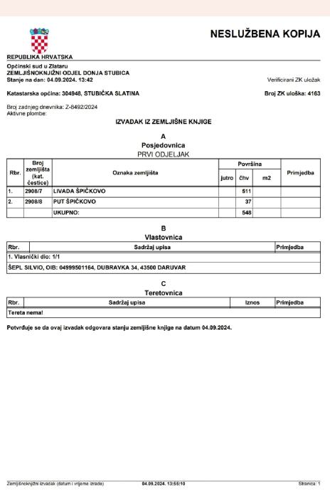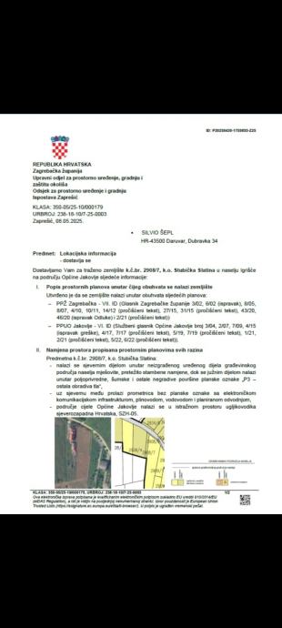 Građevinsko zemljište/ gradilište površine 1971m2 sastoji se od dvije čestice 2908/7 i 2908/8 k.o. Stubička Slatina u mjestu Šipkovica, 20km Zagreb, 5km od Zabok, 4 km Stubičke Toplice. Gradilište je ograđeno na ravnom terenu, idealno za gradnju obiteljske kuće sa velikim dvorištem / okućnicom. Vlasništvo čisto 1/1 i bez tereta. Lokacijska informacija u slikama.