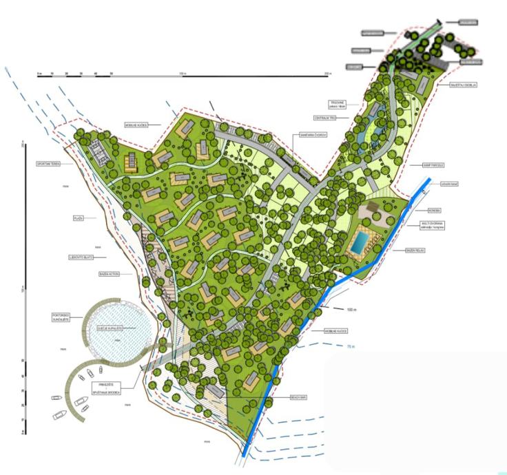 Daje se u prodaju kompletno pripremljeni projekt za kamp, koji se nalazi na samoj plaži. Plaža u vlasništvu duga je 300 metara. Ukupna površina kampa je 30 000 m2.