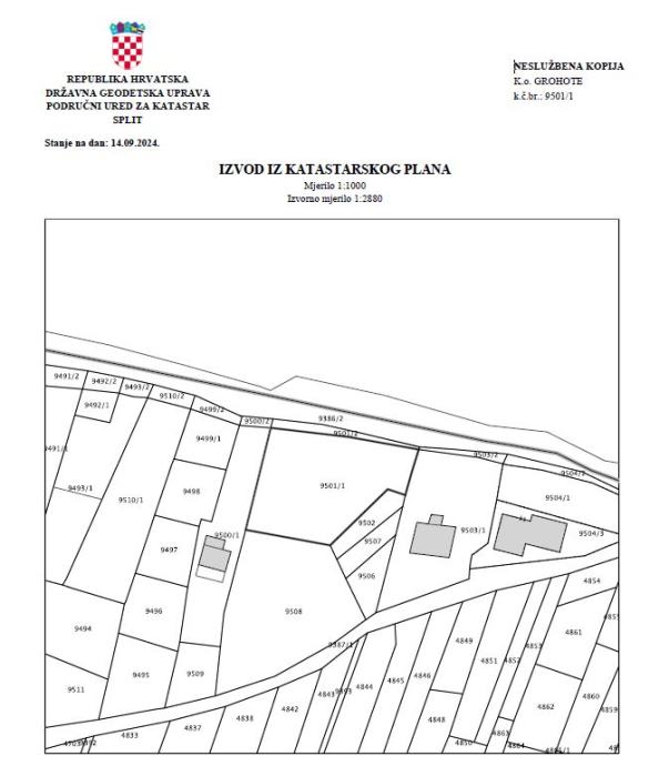 Prodajem lijepu parcelu, trapeznog oblika, veličine 1330 m2 u mjestu Grohote na otoku Šolta. Parcela je po važećem urbanističkom planu u građevinskoj zoni, a nalazi se uz glavnu cestu između Konzuma, ambulante i OPG-a Plenković. Cijena parcele je 199500 eura - 150 e/m2.