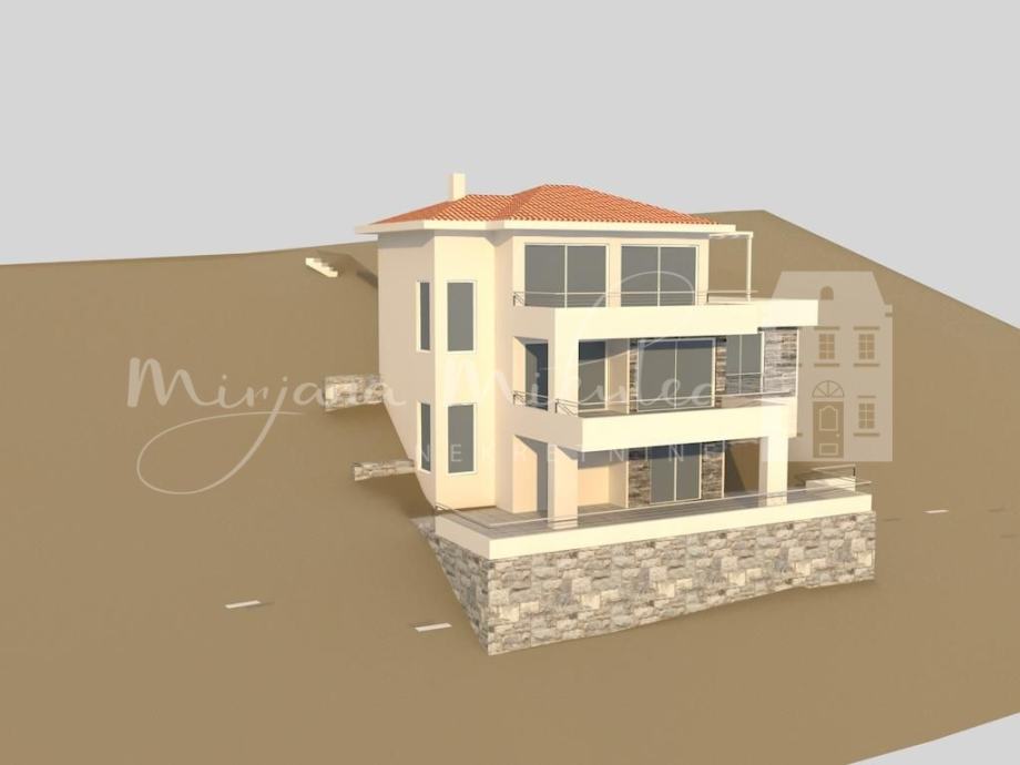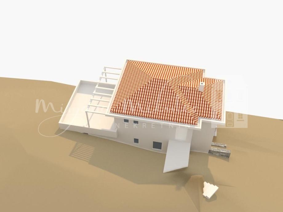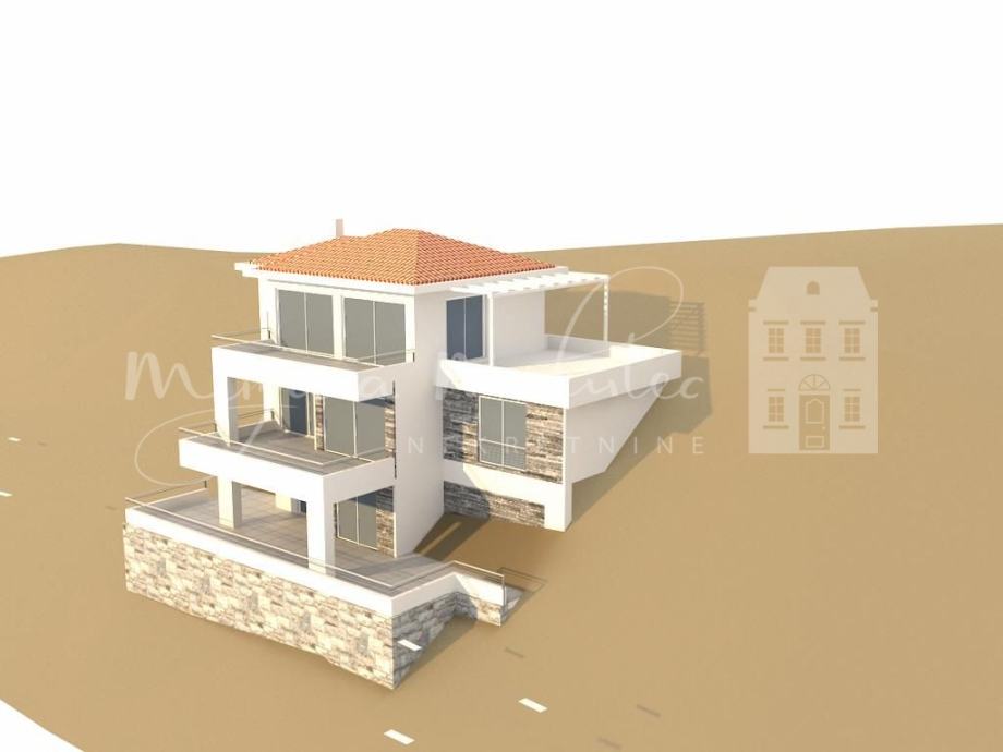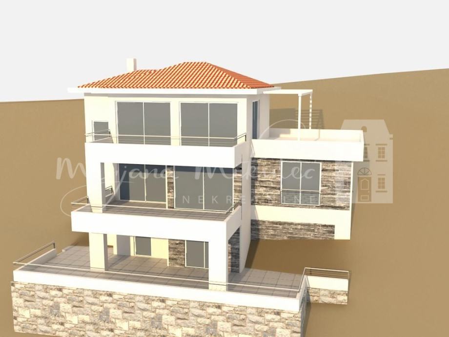 Građevina je namjenjena za stanovanje s jednom stambenom jedinicom. Sastoji se od tri nadzemne etaže (P+2) Prizemlje se sastoji natkrivene terase, konobe, kupaonice i stubišta. I kat se sastoji kuhinje/blagovaonice i dnevnog boravka, terase, stubišta s predprostorom, predsoblja/garderobe, kupaonice, wc-a i spavaonice. II kat se sastoji od tri spavaonice, predsoblja i kupaonice, dvije terase, stubišta i predprostora. Ulaz u objekt se nalazi na drugom katu i u tu svrhu je potrebno iugraditi ulaznu rampu kao i stubište položeno na teren, a to sve zbog vrlo strmog terena. Građevina je od susjednih parcela udaljena min 3 m, a od pristupnog puta 5 m. Nepravilnog je oblika, prilagođena obliku parcele pa maximalni gabariti iznose 14,42*11.14 m. Na parceli su predviđena dva parkirna mjesta.