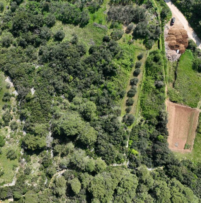 Duža strana je okrenuta prema moru sa predivnim neometanim pogledom na more, nema susjeda sa nijedne strane parcele,sva komunalna infrastruktura je u blizini,ima izlaz na dva različita puta te sadrži vegetaciju maslina I ostalih tradicionalnih bilja...
