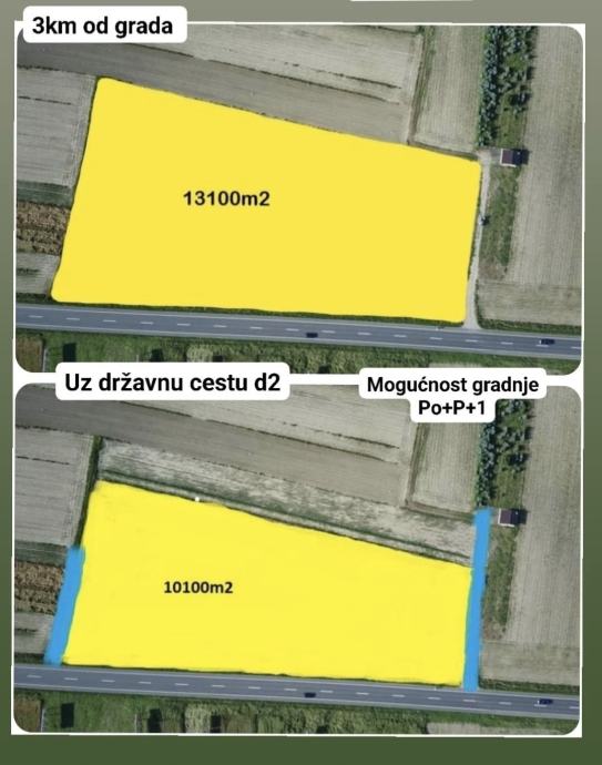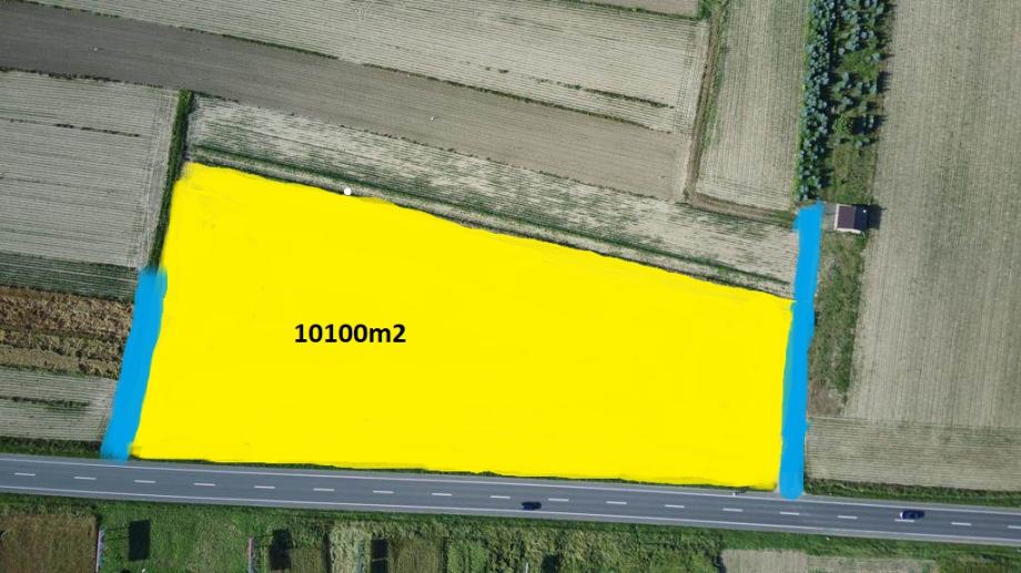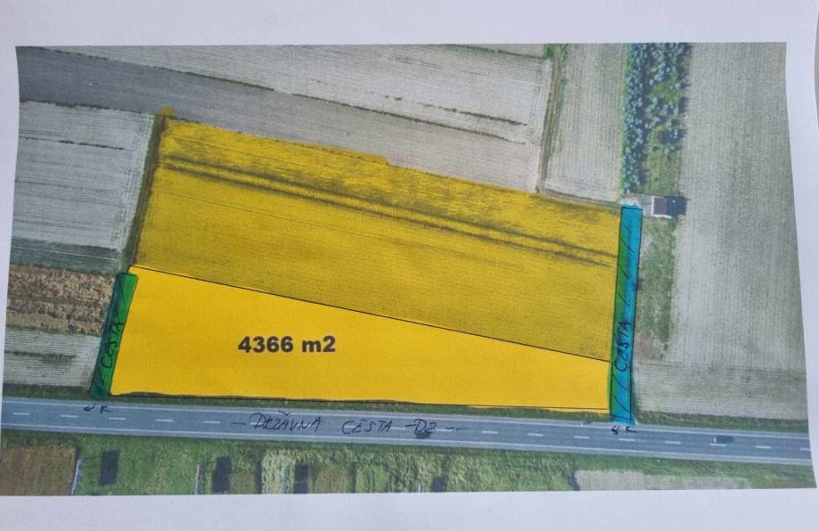 Prodaje se građevinsko zemljište površine 10100m2, koje se nalazi u neizgrađenom dijelu građevinskog područja naselja - unutar područja rezervirane zone gospodarske namjene - POSLOVNA ZONA-..,.uz državnu cestu D2..blizina aerodroma...dužina zemljišta uz prometnicu 170m