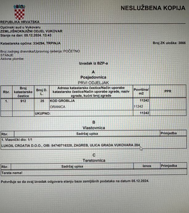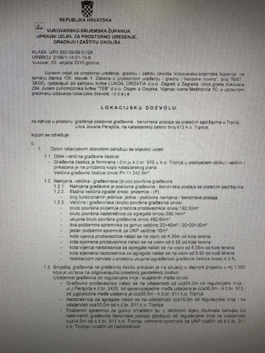 Prodaje se građevinsko zemljište u Trpinji površine 11.200 m2, s lokacijskom dozvolom i idejnim projektom za izgradnju benzinske pumpe.