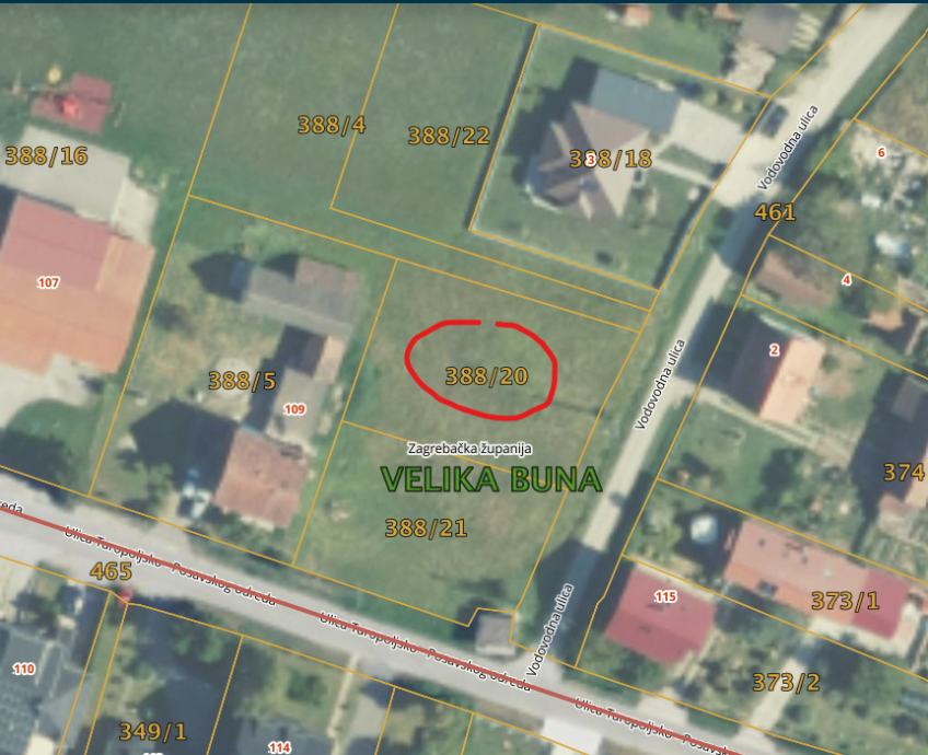 Prodaje se građevinsko zemljište površine 800 m² u Velikoj Buni (grad Velika Gorica), smješteno u mirnoj slijepoj ulici okruženoj obiteljskim kućama.