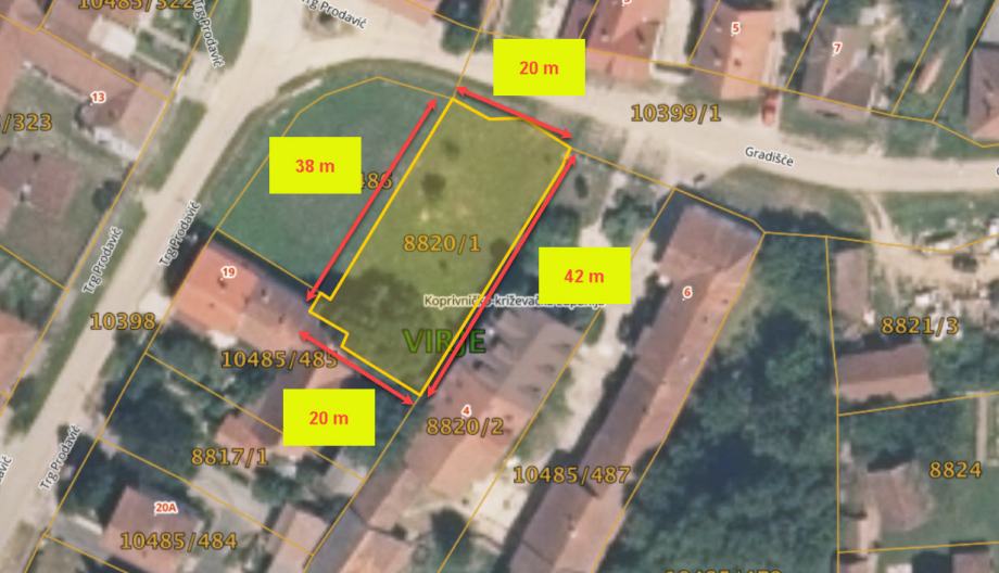 Širina zemljišta koje gleda na cestu i suprotnu stranu je 20 m, a dužina zemljišta je 38 m sa lijeve, a 42 m sa desne strane.