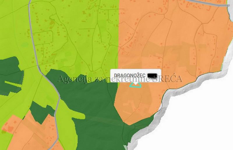 Građevinsko zemljište u Donjem Dragonožcu površine 2035m2. Parcela je trokutastog oblika. Smjer pružanja parcele je sjever-jug. Teren je blago brežuljkast. Kvadratura je idealna za izgradnju vikendice ili manje kuće za odmor. Do zemljišta vodi put koji je službeno ucrtan. Do makadamske šumske ceste je nekih 100m šumskog puta,kao i do priključka vode. U blizini je svega par vikendica, tako da je pozicija idealna za nekoga tko želi pobjeći od gradske vreve vikendom ili pak na više dana.