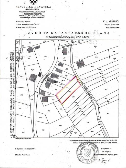 Črnomerec, Frateršćica, Put Josipa Šabana, uz Kvaternikovu ulicu, vrh brežuljka, južna strana, 17,5 x 45 m. Dvije BUS stanice do tramvaj.okretišta Črnomerec, blizu dućani, škola, crkva, itd. Puca vidik na sve strane. Cijena : cca 85 eur/m2. Hitno prodajem, molim cijenjene ponude telefonom(01 888 9655) ili e-mailom, hvala.