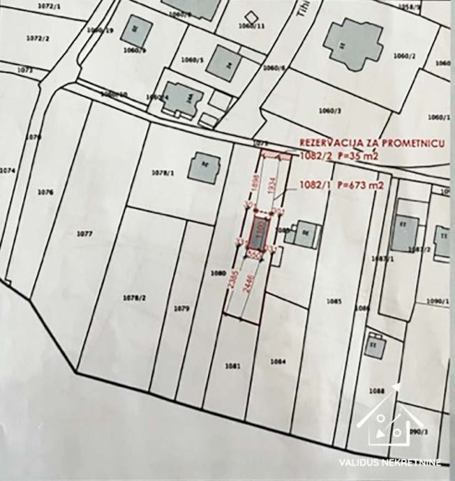 Zemljište se sastoji od dvije zemljišne čestice od kojih se jedna prema odredbama GUP-a nalazi unutar zone stambene namjene urbano pravilo 2.2. (površina 708 m2), a druga u zoni zelenila urbano pravilo 2.13. (površina 457 m2). Postoji mogućnost kupovine susjednog terena desno od ovog gledano s ceste.