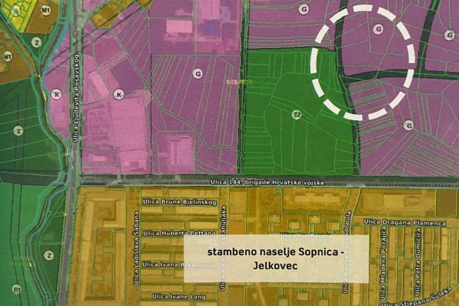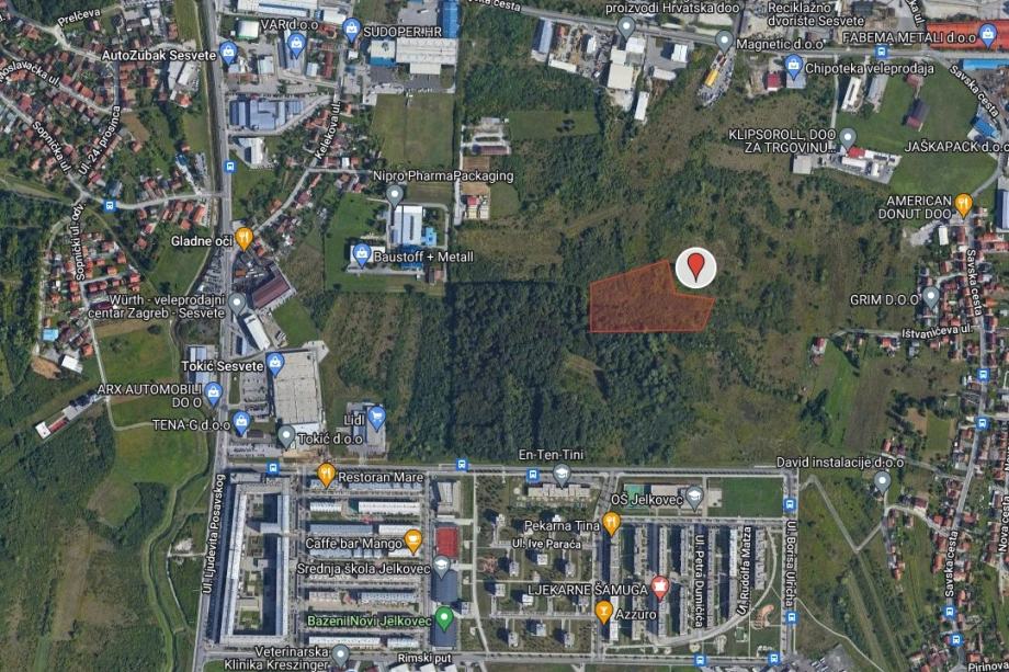 Građevinsko zemljište površine 5. 088 m2 nalazi se u Sesvetama, u blizini naselja Jelkovec.