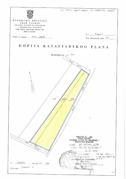 Širina uz ulicu 40 m, dužina cca 150 m, parcela se suzuje na kraju na 20 m, sve prema priloženom planu !