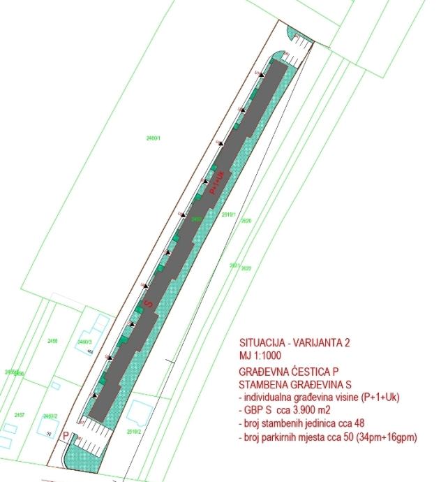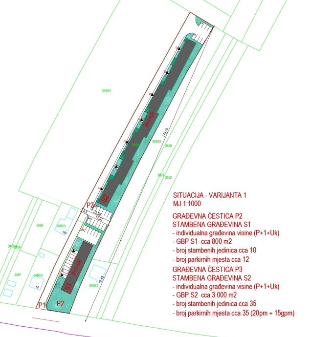 - Prvo idejno rješenje: parcela je podijeljena na tri parcele (manja parcela - koja predstavlja pristupni put - max. 75 m i dvije parcele od 3.909 m2 i 1.316 m2). Na većoj parceli planirana je izgradnja 35 stambenih jedinica i 35 parking mjesta, a na manjoj parceli 10 stambenih jedinica i 12 parking mjesta. Pojedinačna visina objekta je P+1+Uk.