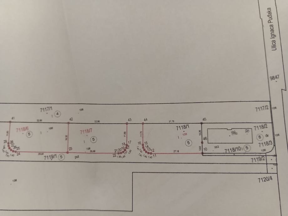 Prodaja g. zemljišta ul. Ignaca Puđaka , produžetak između dva nova objekta Gradilišta od 504 i 534 kvadrata itd. po 140e ,mkv. mogućnost kupnje i više zemljišta na pr, 3770 kvadrata za veće građevinare tada je cijena po dogovoru Mogućnost gradnje objekta u nizu ili na svakom grad.bruto 150mkv. prizemlje kat i tavanske prostorije Napravljena parcelacija