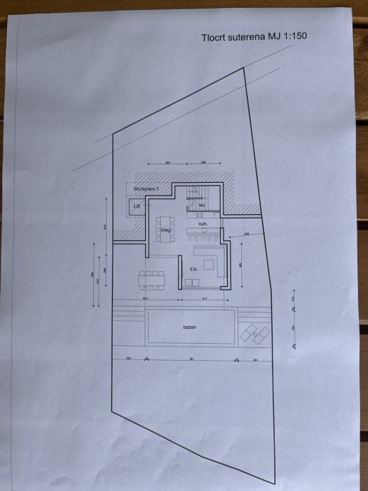 Izrađeno je idejno rješenje - PROJEKT budućeg objekta veličine 220 m2 (suteren, prizemlje i kat) s dva parkirališna mjesta i bazenom.
