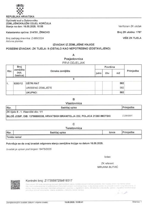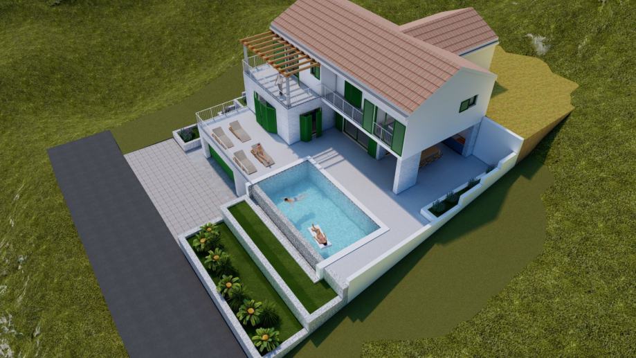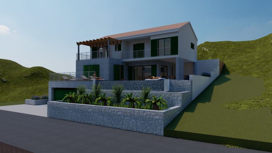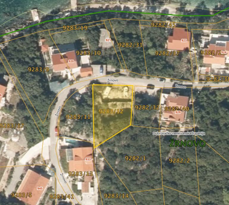 Prodaje se građevinsko zemljište (k.č. 9283/12 u k.o. Žrnovo) površine 582 m2, smješteno na otoku Korčuli u mjestu Oštri Rat (Tri Žala). Zemljište se nalazi na mirnijem dijelu otoka te je udaljeno oko 40 m od mora. Na parceli je izrađen geodetski elaborat, vlasništvo je 1/1, te je ishodovana pravomoćna građevinska dozvola. Budući kupac ima mogućnost izmjene projekta po svojim željama. Na parceli je odrađen iskop kojeg je potrebno manje doraditi. Građevinskom dozvolom obuhvaćeni su bazen površine 30 m2 i objekt ukupne bruto površine u iznosu od 330m2 sa sljedećim rasporedom po katovima: