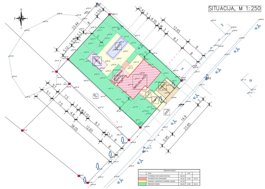 Širina (do ceste) = 24m, dužina 37.5m, pravilnog oblika.
