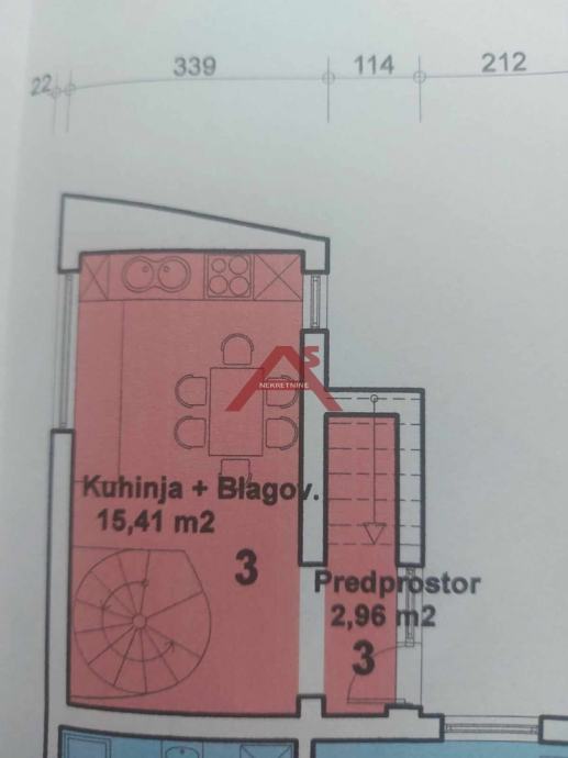 U prizemlje je predprostor, kuhinja i blagovaonica,
