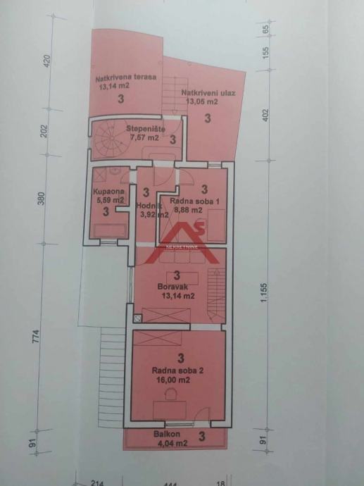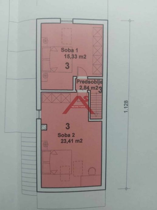 U potkrovlju je predsoblje i dvije spavaće sobe.
