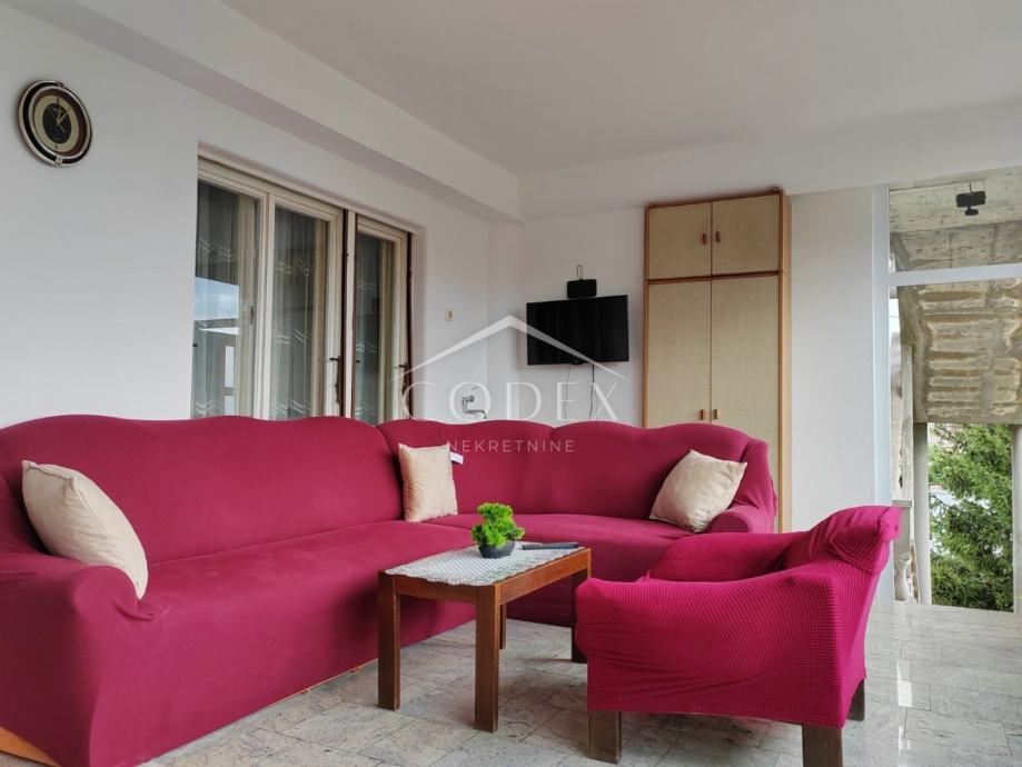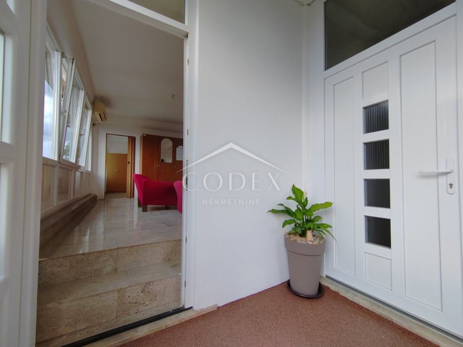 Sunčana ostakljena veranda pruža prekrasan pogled na more, stvarajući savršeno mjesto za opuštanje nakon napornog radnog dana.