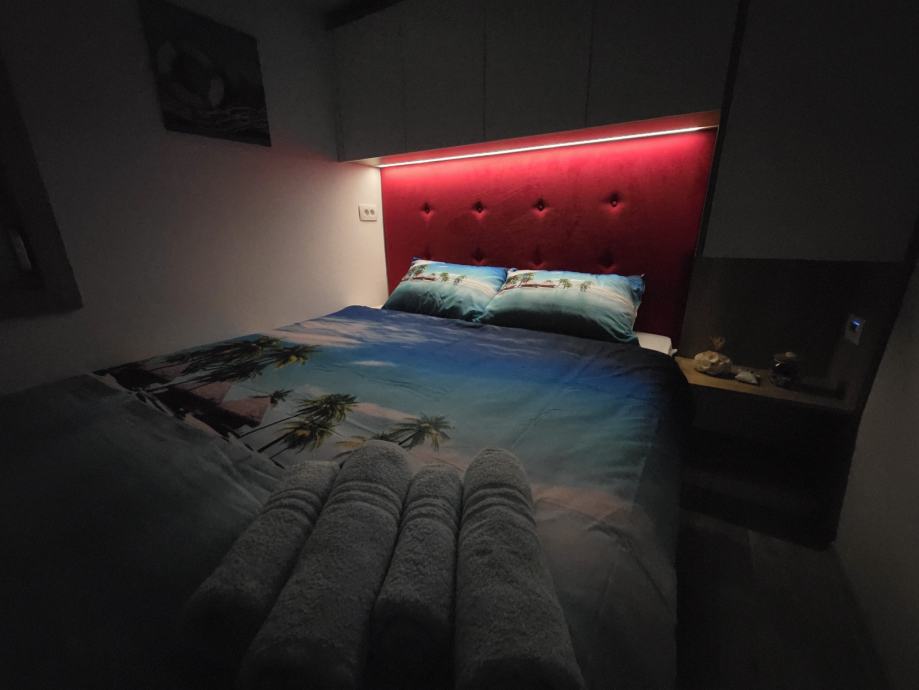 - POSTELJE Z DVIŽNIM MEHANIZMOM ZA ODLAGANJE IN HRBTNIM DELOM V RDEČEM ŽAMETU, TER LED DIMERJEM