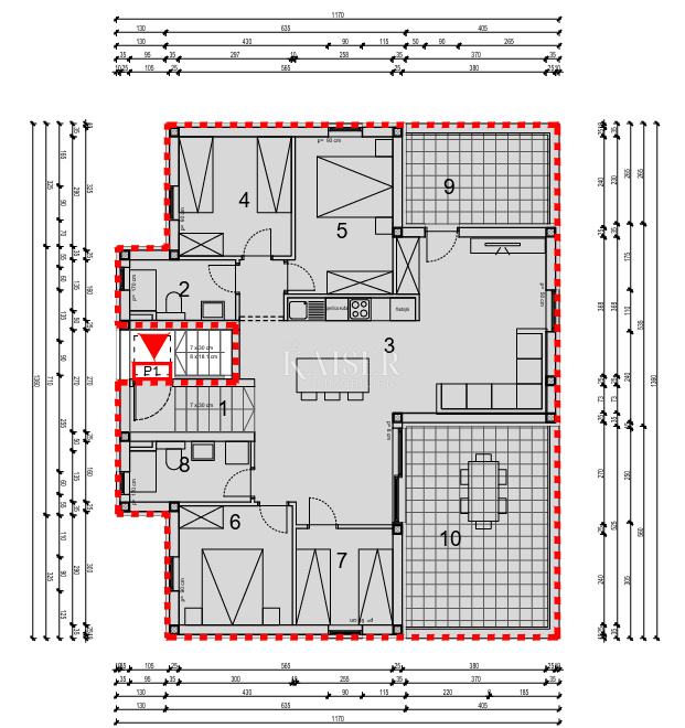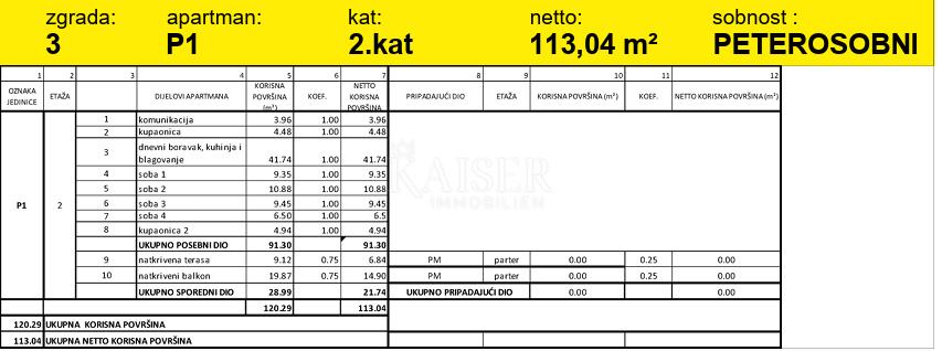 Stan, oznake P1, nalazi se na drugom katu zgrade i nudi ukupnu netto korisnu površinu od 113,04 m² (uključujući stambeni dio i vanjske prostore po koeficijentima). Unutarnji stambeni prostor od 91,30 m² je izuzetno prostran i funkcionalno raspoređen, pružajući maksimalan komfor za veliku obitelj ili one koji cijene luksuz i prostor.