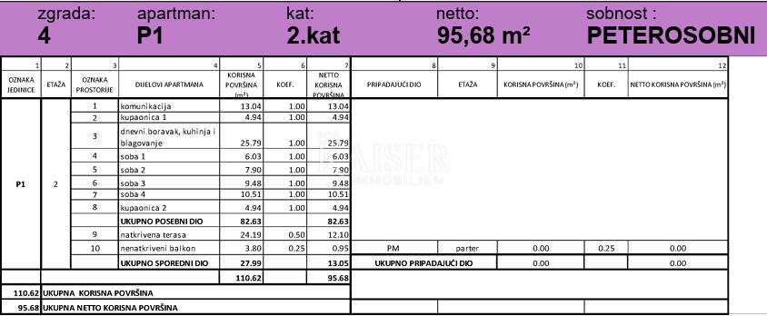 Stan, oznake P1 u zgradi 4, nalazi se na drugom katu i nudi ukupnu netto korisnu površinu od 95,68 m² (uključujući stambeni dio i vanjske prostore po koeficijentima). Unutarnji stambeni prostor od 82,63 m² je izuzetno prostran i pametno raspoređen, pružajući maksimalan komfor za veliku obitelj.