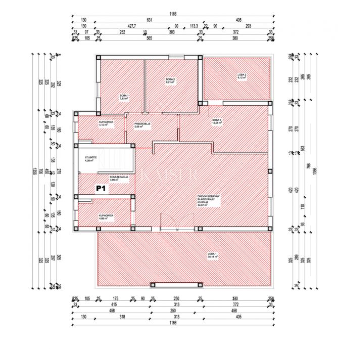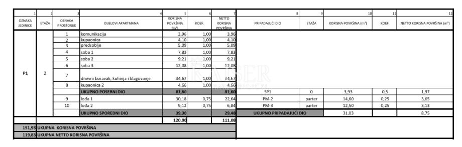 Stan, oznake P1, nudi ukupnu netto korisnu površinu od 119,83 m² (uključujući stambeni dio, lođe i pripadajuće dijelove po koeficijentima). Unutarnji stambeni prostor od 81,60 m² je odlično raspoređen, s jasno odvojenim dnevnim i spavaćim dijelom, te nudi obilje prostora za obitelj.