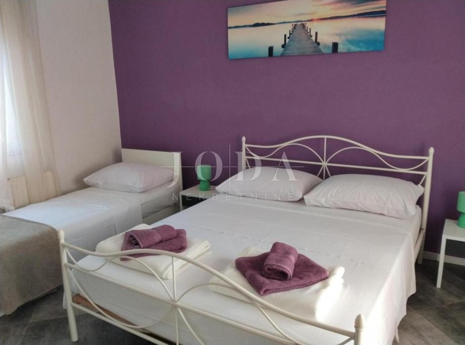 U prizemlju se nalazi ulazni hodnik koji vodi do moderne kuhinje s blagovaonicom, prostrane kupaonice te ugodnog dnevnog boravka s kaminom na drva, koji prostoru daje toplinu i poseban šarm. Unutarnje stepenice vode na kat gdje su smještene tri udobne spavaće sobe i dodatna kupaonica. Dvije sobe izlaze na veliki zajednički balkon s prekrasnim pogledom na more, dok treća soba ima vlastiti intimni balkon.