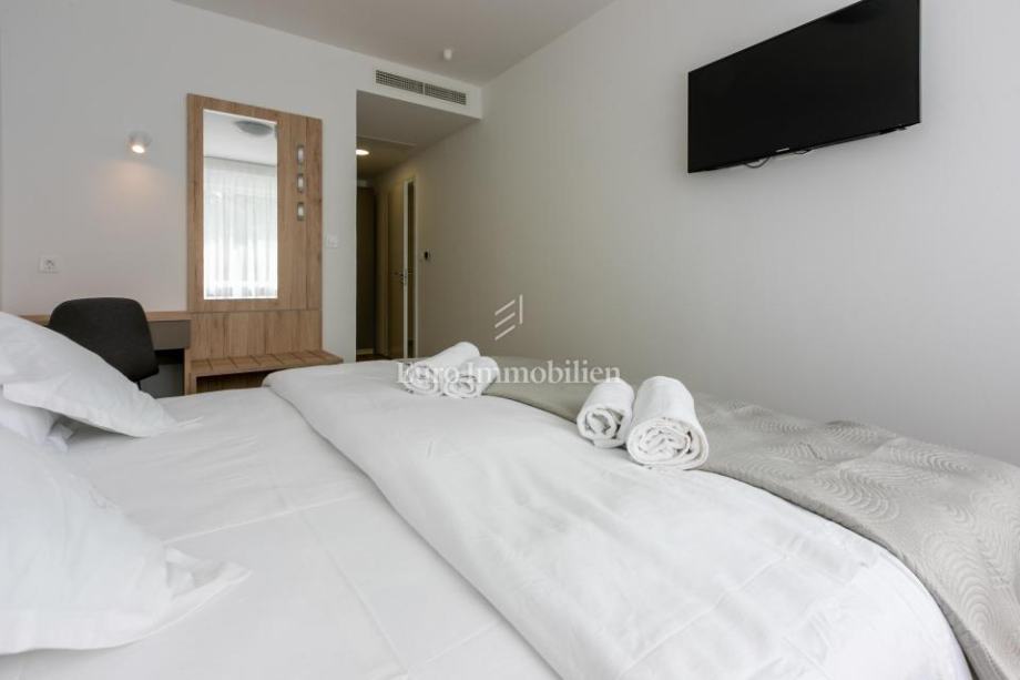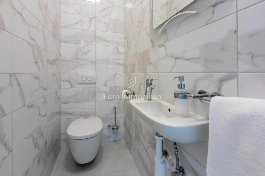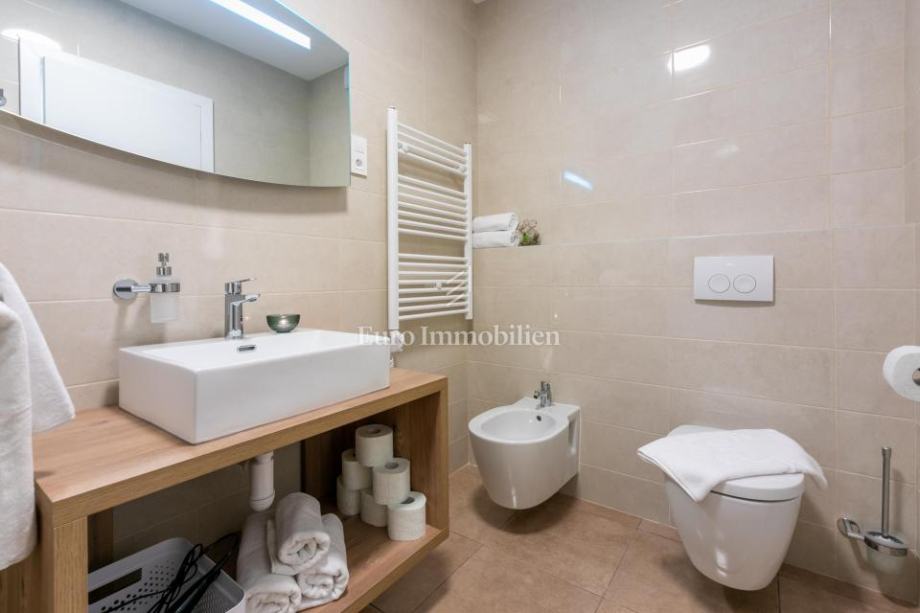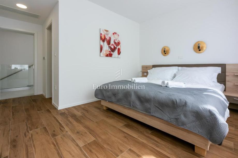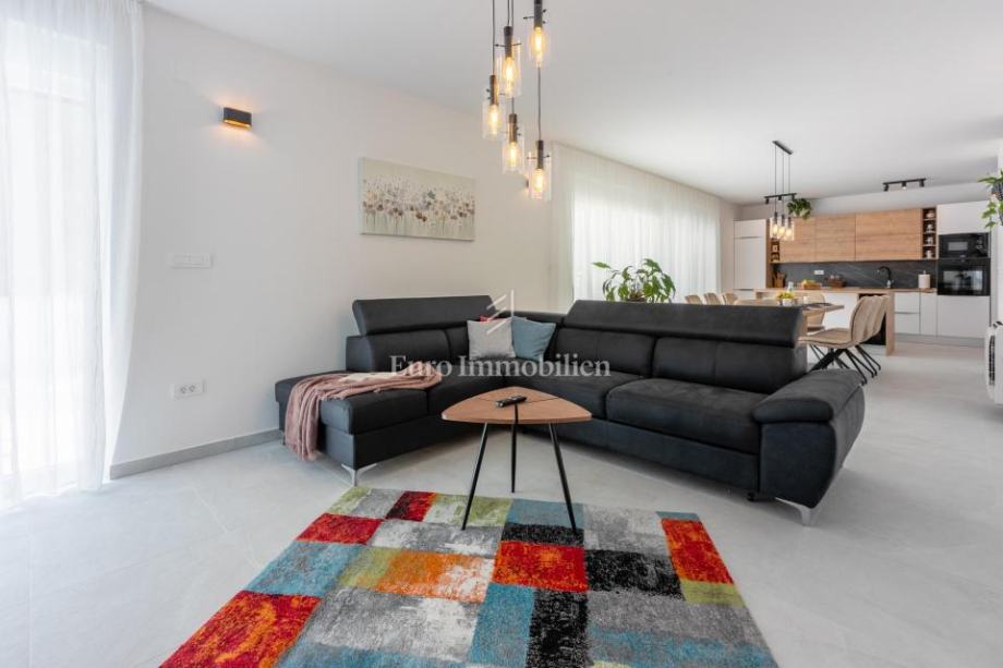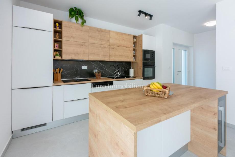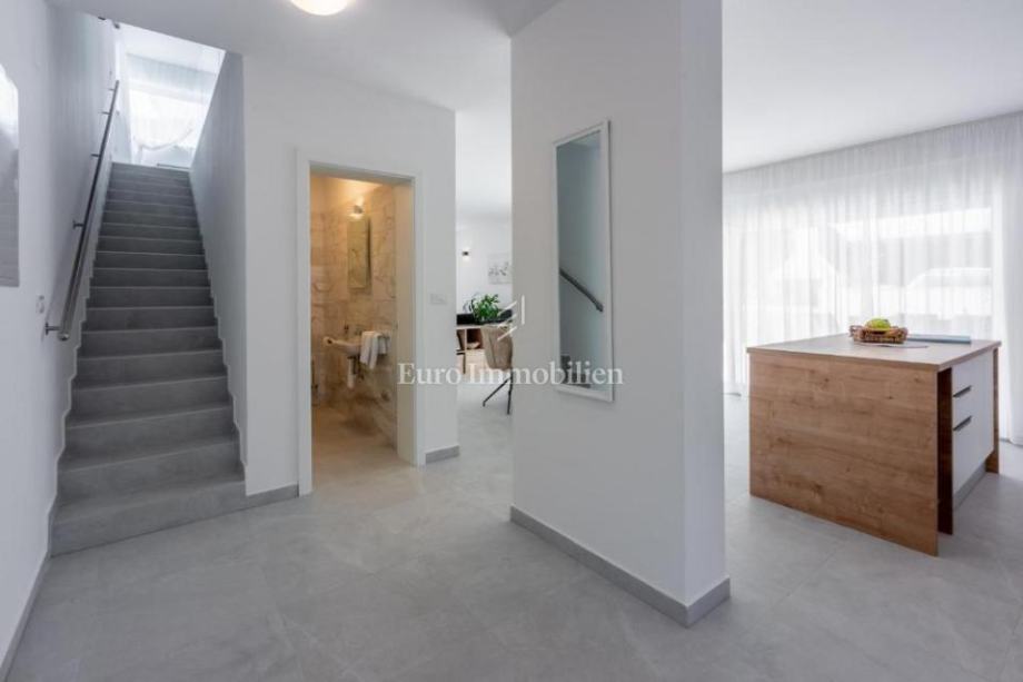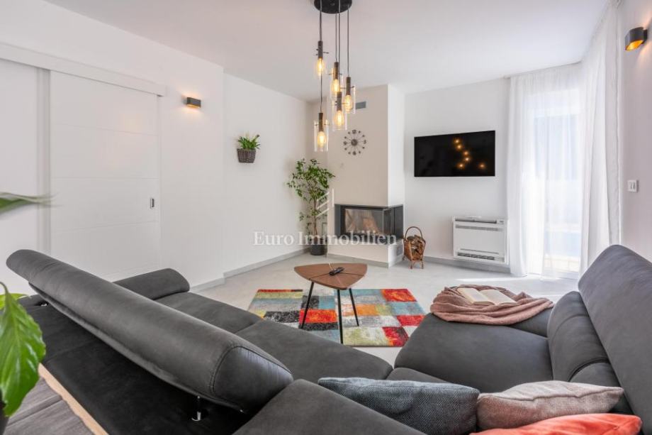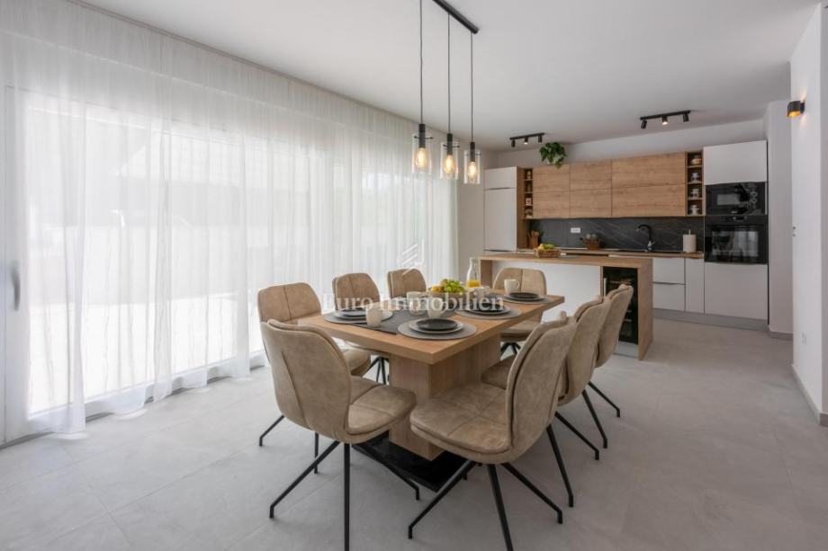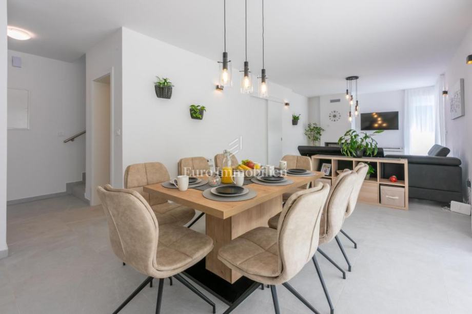 Sastoji se od funkcionalno uređenog dnevnog dijela s kuhinjom i blagovaonicom te tri spavaće sobe i tri kupaonice. Uređeni vanjski prostor uključuje privatni bazen i dva parkirna mjesta, što ovu nekretninu čini odličnom prilikom za život ili investiciju.