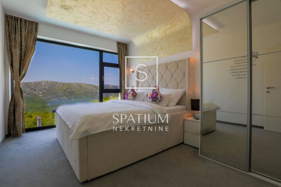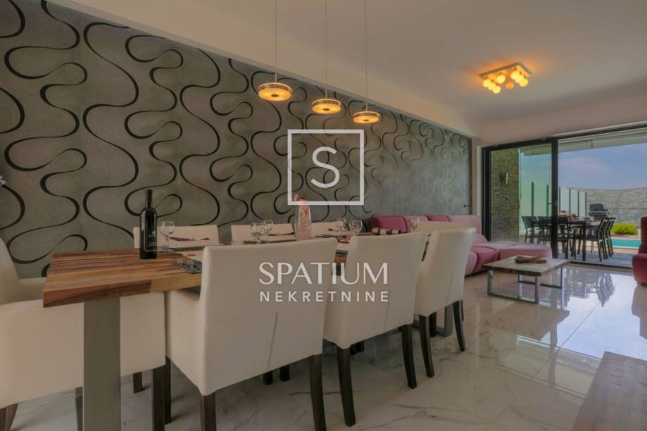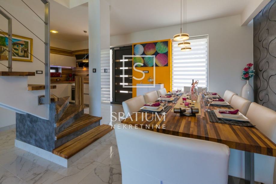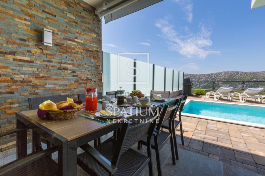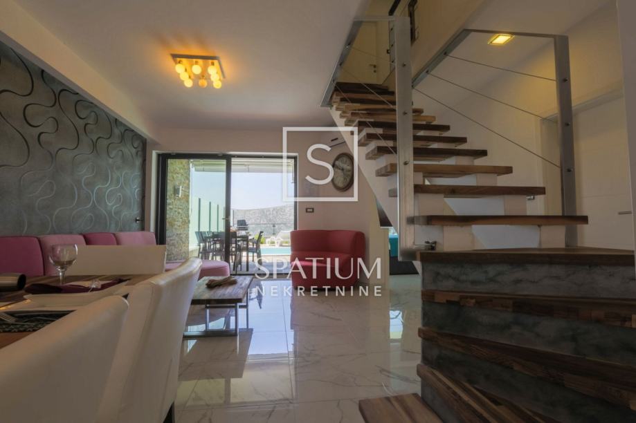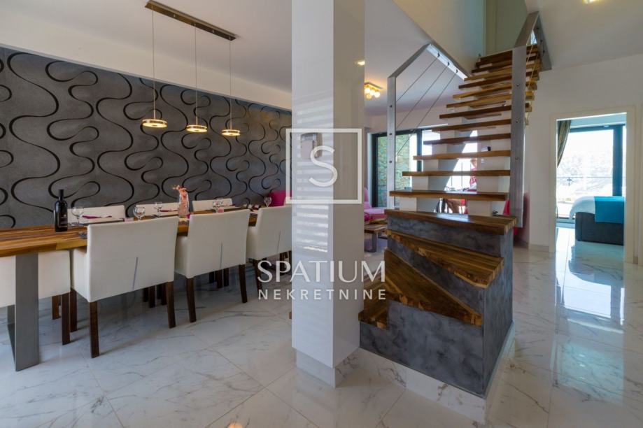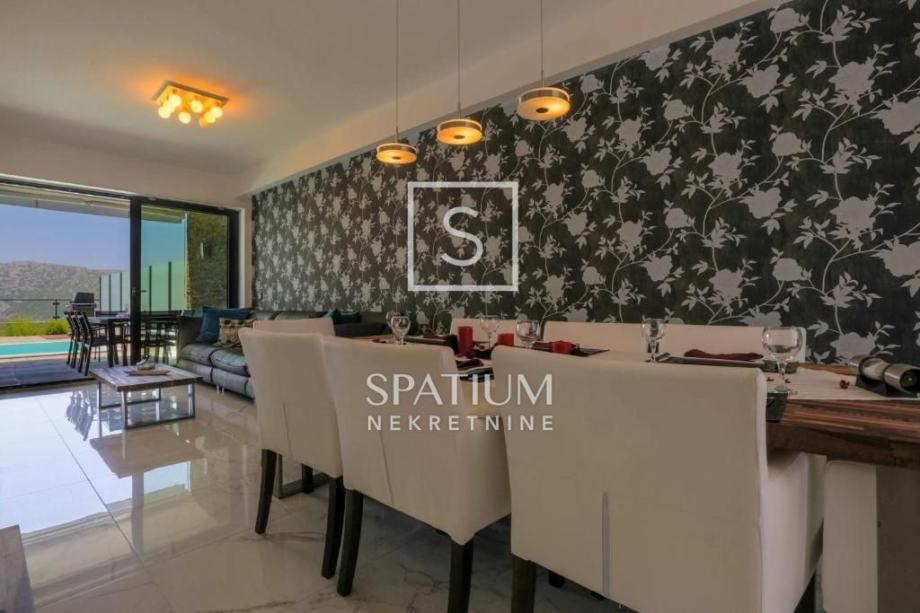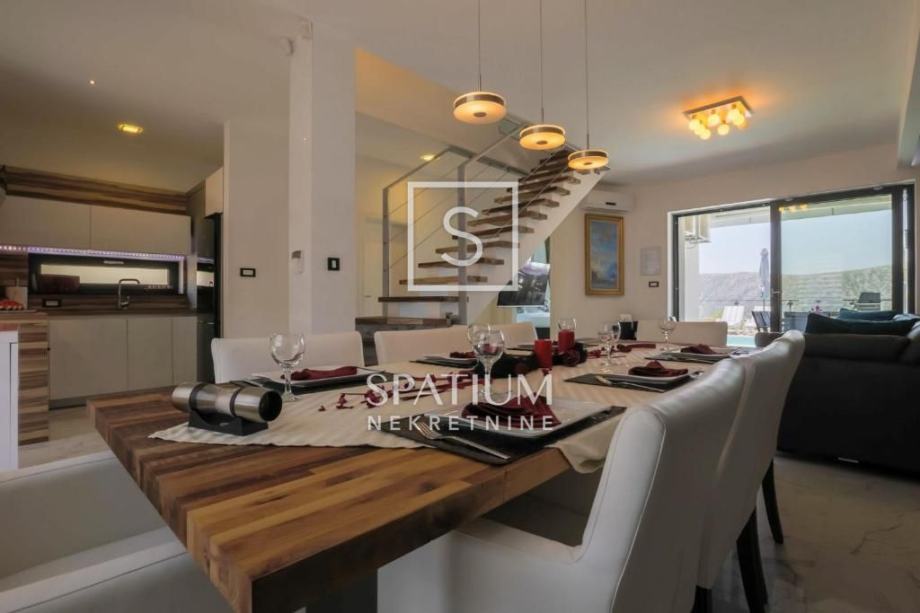 GRIŽANE, u ponudu smo dobili jedinstvenu urbanu vilu u zaleđu, površine 220 m2 i okućnice od 602 m2. Sadrži dva dvoetažna stana, svaki od njih u prizemlju ima kuhinjsko-blagovaonski prostor povezan s velikim dnevnim boravkom iz kojeg se izlazi na terasu s bazenom. U prizemlju se također nalazi jedna spavaća soba te kupaonica. Svaki od stanova, na katu ima tri prostrane spavaće sobe s vlastitim kupaonicama. Dvije sobe imaju balkone dok treća zauzima mjesto van osnovnih gabarita kuće, što joj omogućava spektakularan pogled prema moru i okolici. Svakom stanu pripada i ostava te tri parkirna mjesta. Objekt je građen od visokokvalitetnih materijala, stolarija je vrhunske kvalitete što garantira trajnost i visoku energetsku učinkovitost. Kvaliteta gradnje zadovoljava i najviše standarde struke. Modernog je dizajna, s velikim staklenim površinama. Opremljena je sustavima za video nadzor i alarmom. Lokacija i komfor ove vile osiguravaju idealno mjesto za miran život, kao i za svrhu turističkog najma.
