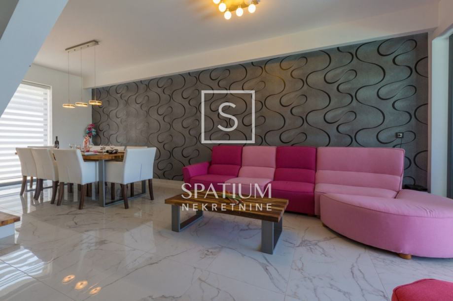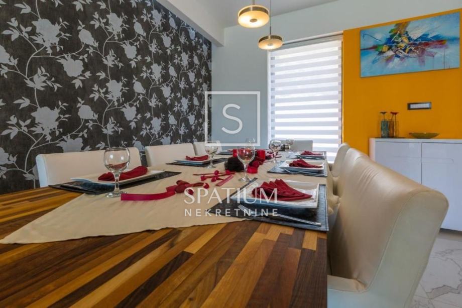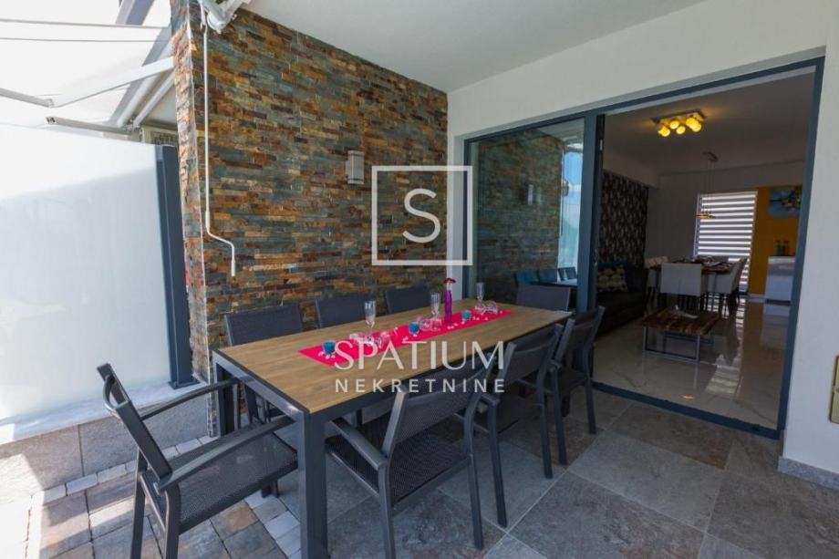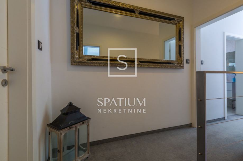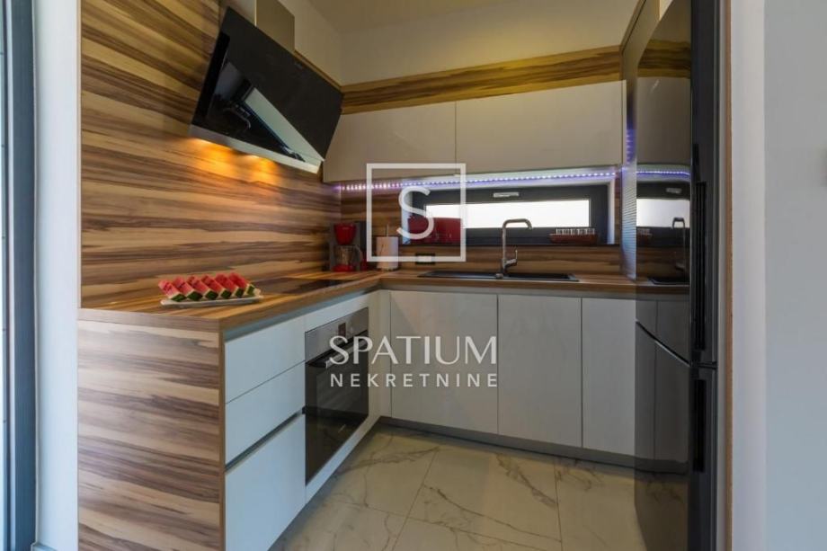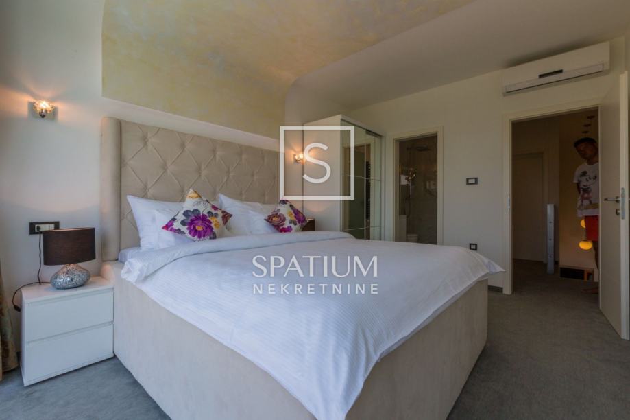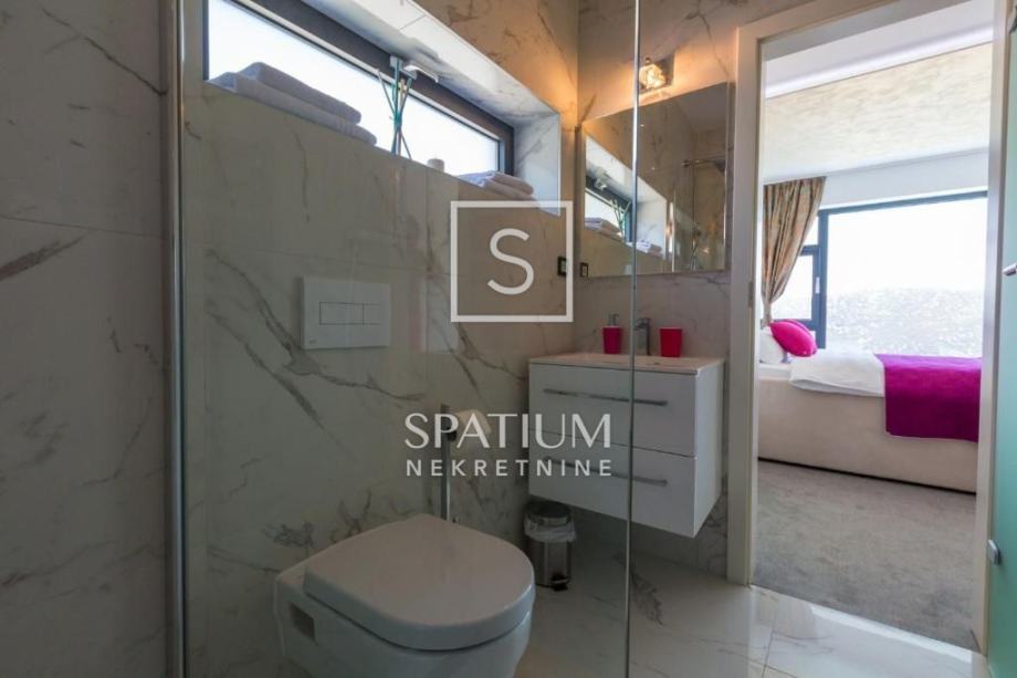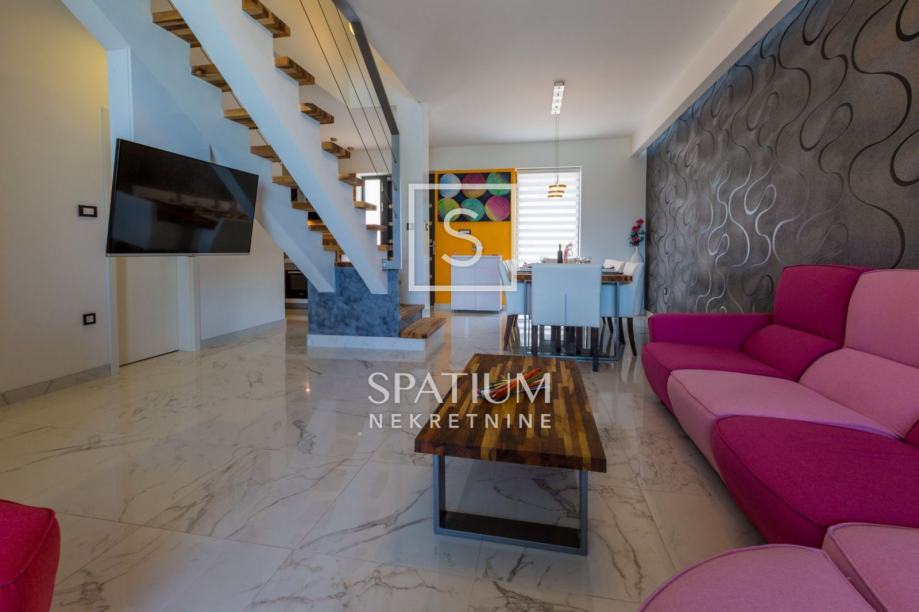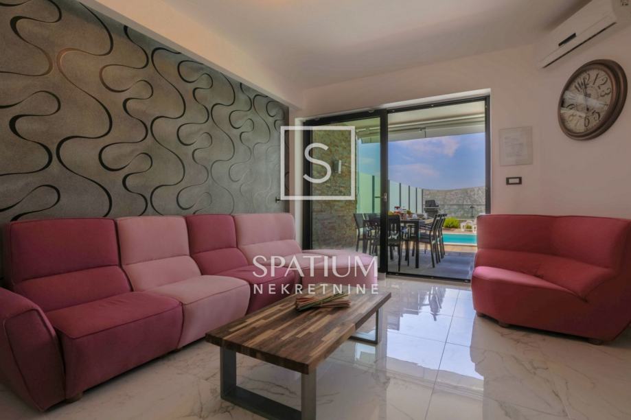 GRIŽANE, u ponudu smo dobili jedinstvenu urbanu vilu u zaleđu, površine 220 m2 i okućnice od 602 m2. Sadrži dva dvoetažna stana, svaki od njih u prizemlju ima kuhinjsko-blagovaonski prostor povezan s velikim dnevnim boravkom iz kojeg se izlazi na terasu s bazenom. U prizemlju se također nalazi jedna spavaća soba te kupaonica. Svaki od stanova, na katu ima tri prostrane spavaće sobe s vlastitim kupaonicama. Dvije sobe imaju balkone dok treća zauzima mjesto van osnovnih gabarita kuće, što joj omogućava spektakularan pogled prema moru i okolici. Svakom stanu pripada i ostava te tri parkirna mjesta. Objekt je građen od visokokvalitetnih materijala, stolarija je vrhunske kvalitete što garantira trajnost i visoku energetsku učinkovitost. Kvaliteta gradnje zadovoljava i najviše standarde struke. Modernog je dizajna, s velikim staklenim površinama. Opremljena je sustavima za video nadzor i alarmom. Lokacija i komfor ove vile osiguravaju idealno mjesto za miran život, kao i za svrhu turističkog najma.